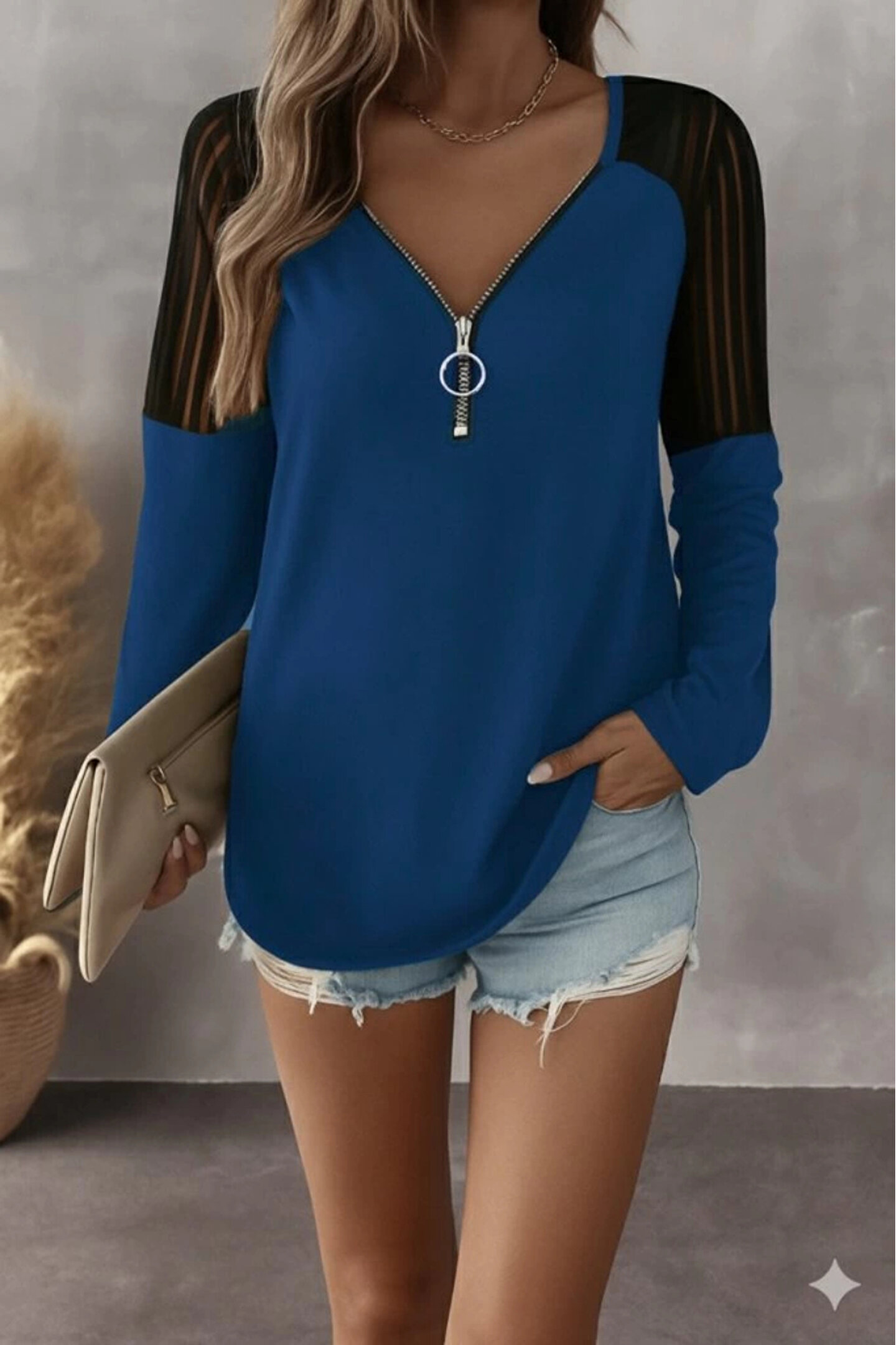 Kadın Uzun Kollu Yakadan Fermuarlı Viskon Bluz