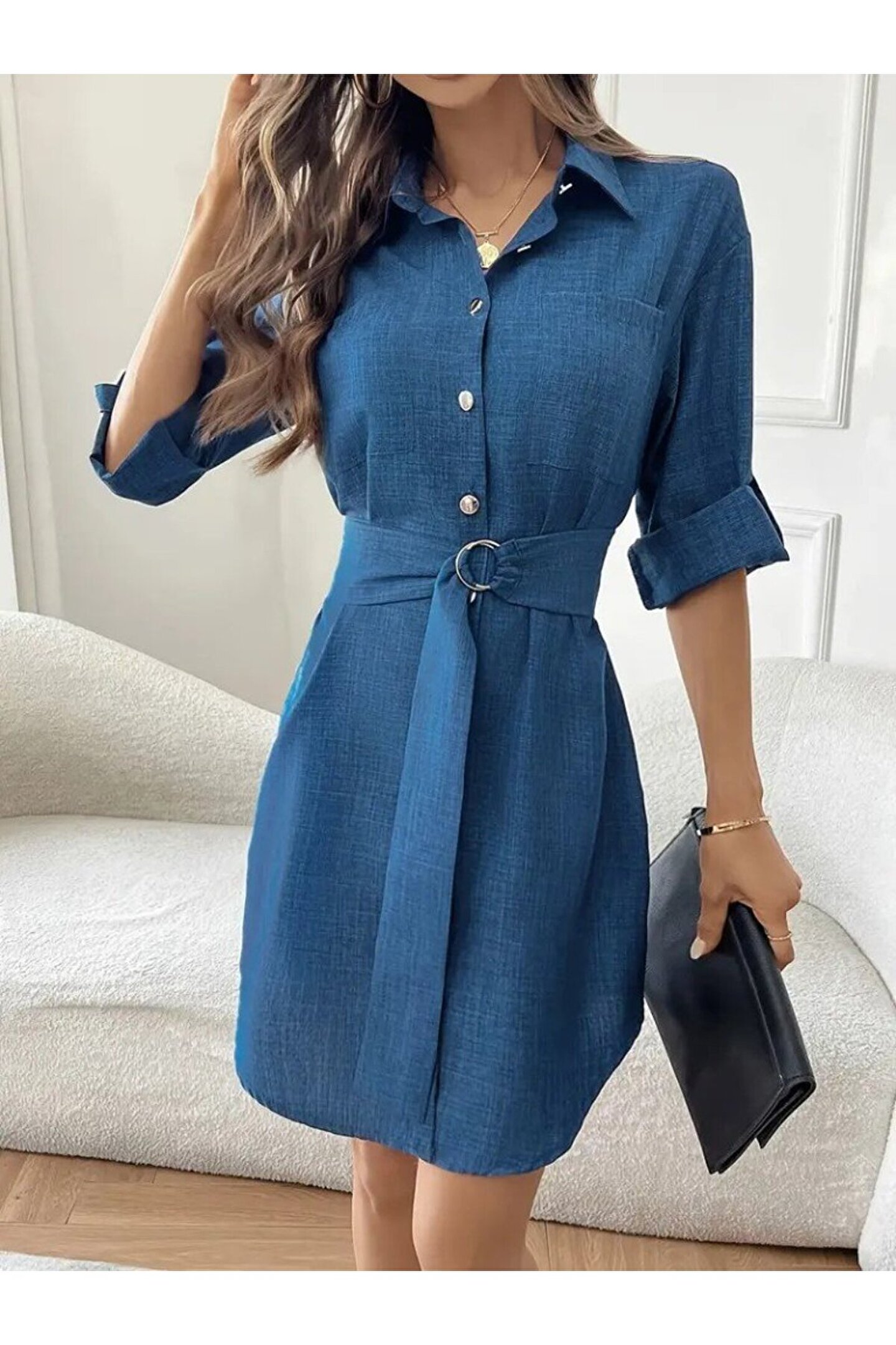 Kadın Uzun Kollu Yakalı önden Düğmeli Beli Kuşaklı Mini Ithal Keten Elbise