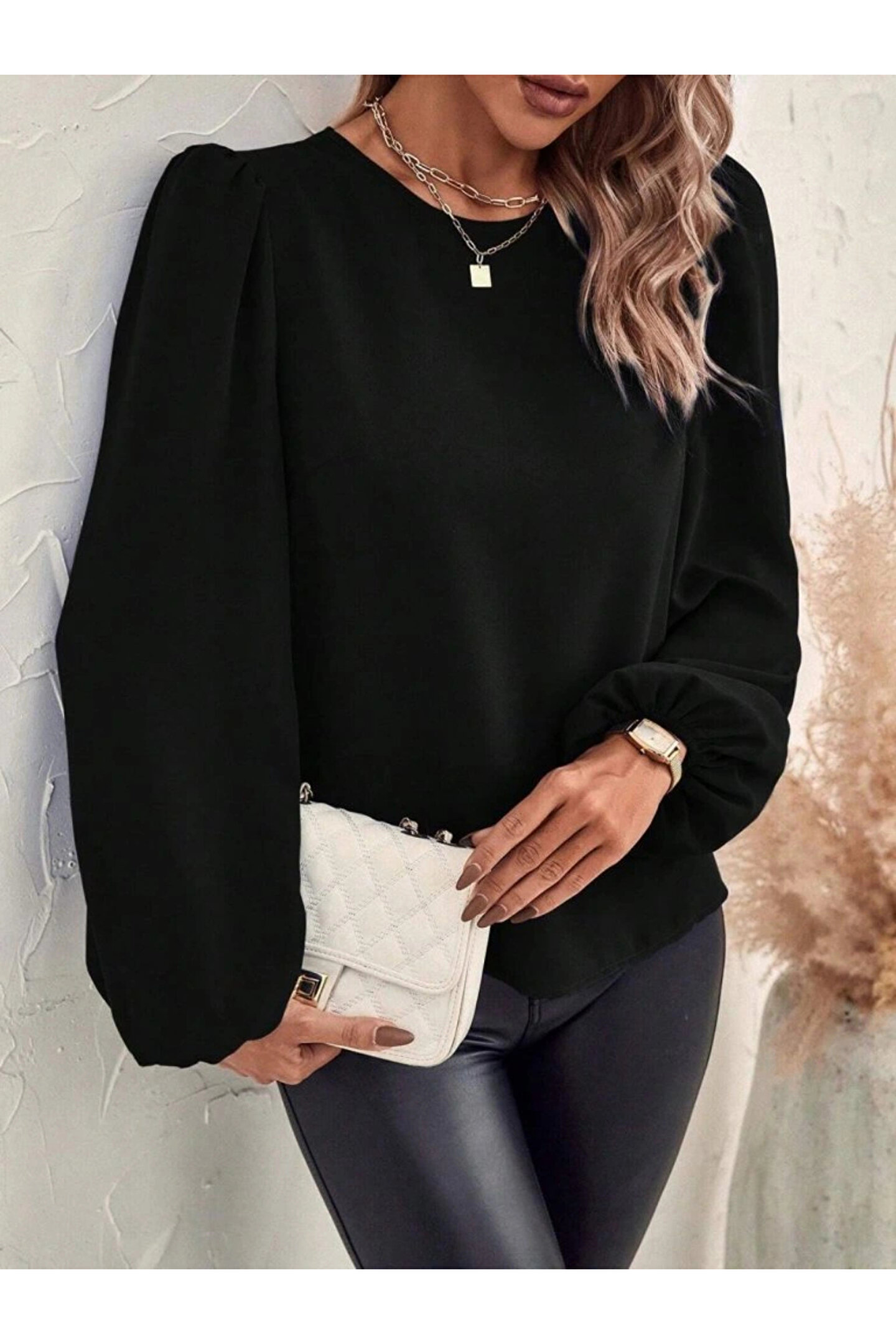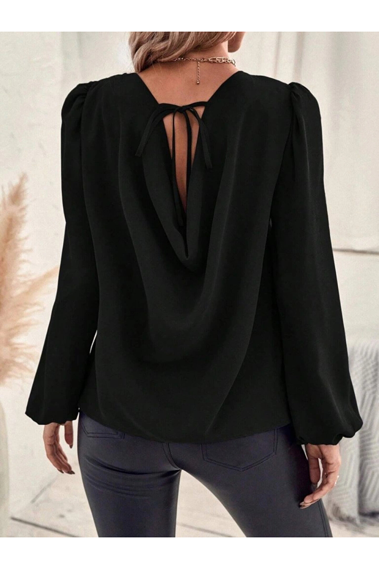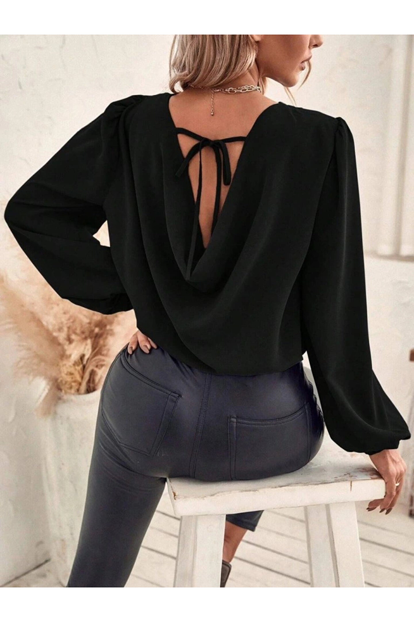 Kadın Uzun Kollu Yuvarlak Yaka Arkadan Bağcıklı Salaş Ithal Krep Bluz