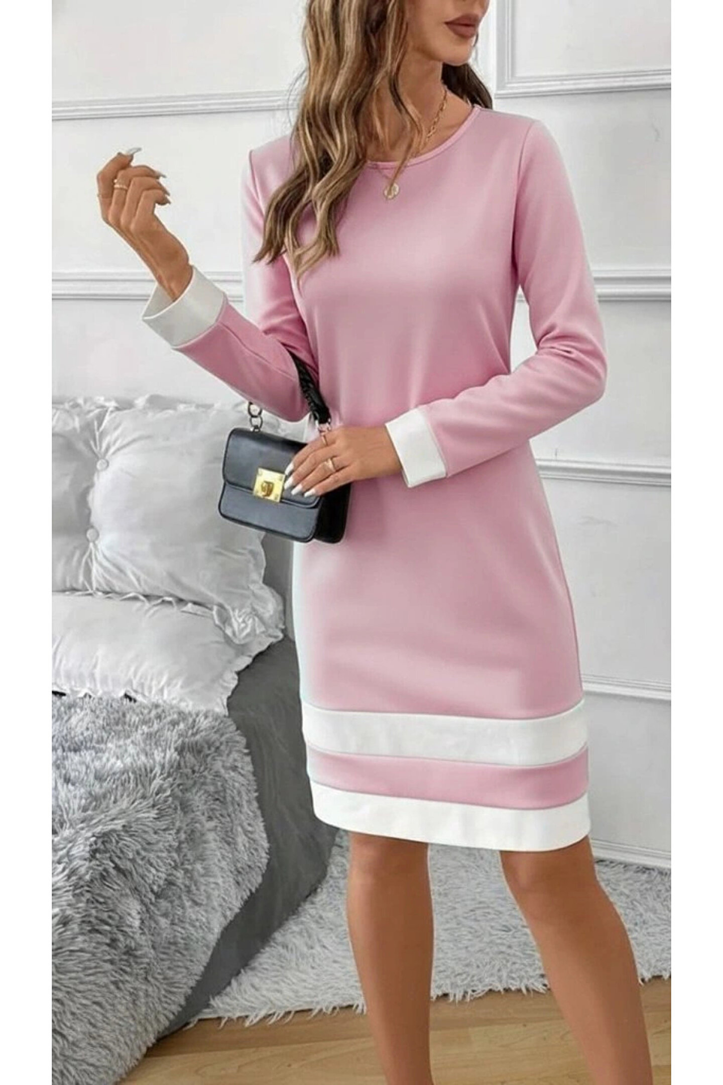 Kadın Uzun Kollu Yuvarlak Yaka Etek Ucu şerit Detaylı Mini Dalgıç Elbise