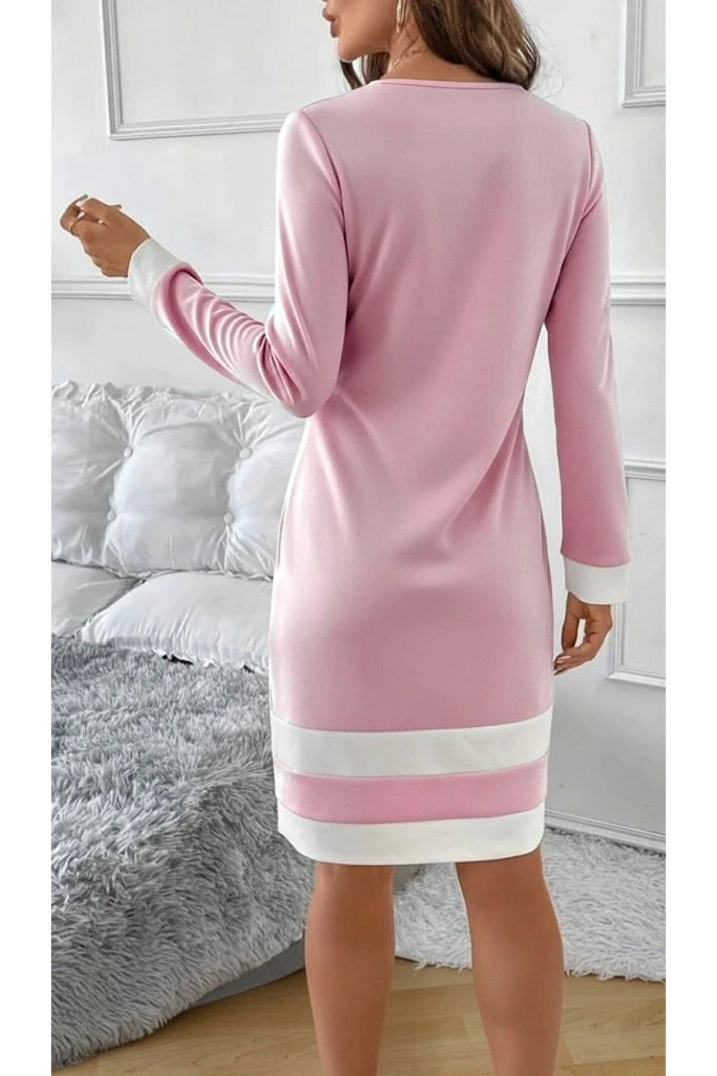 Kadın Uzun Kollu Yuvarlak Yaka Etek Ucu şerit Detaylı Mini Dalgıç Elbise