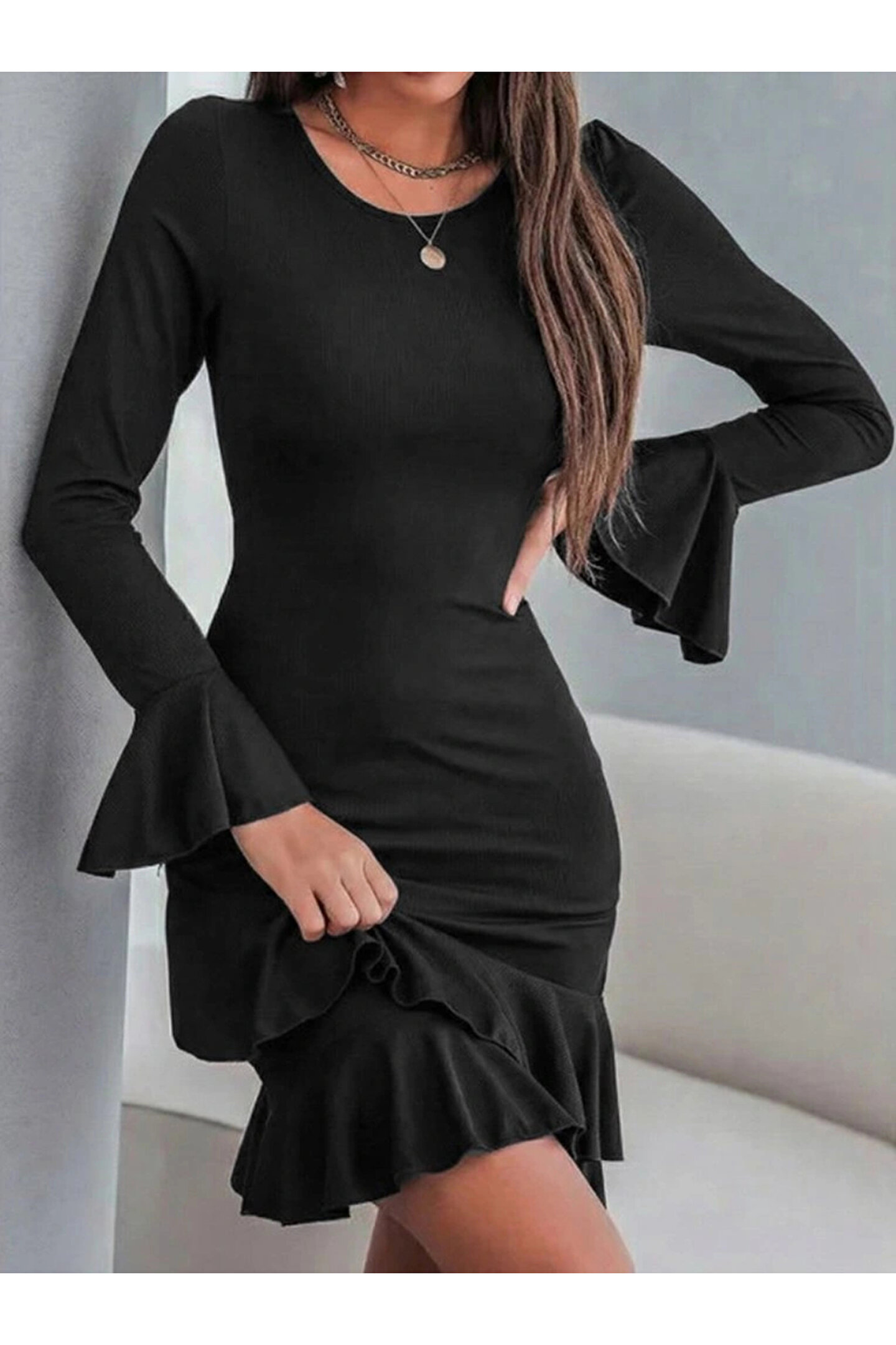 Kadın Uzun Kollu Yuvarlak Yaka Fırfırlı Kol Ucu Volanlı Janjan Krep Mini Elbise