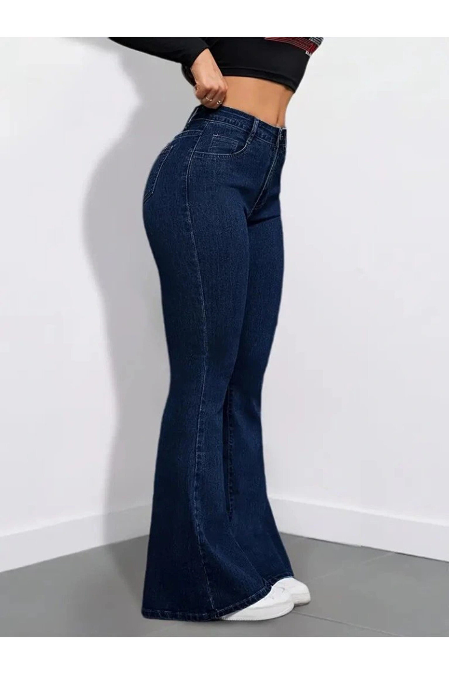 Kadın Yüksek Bel Cepli İspanyol Paçalı Kot Pantolon