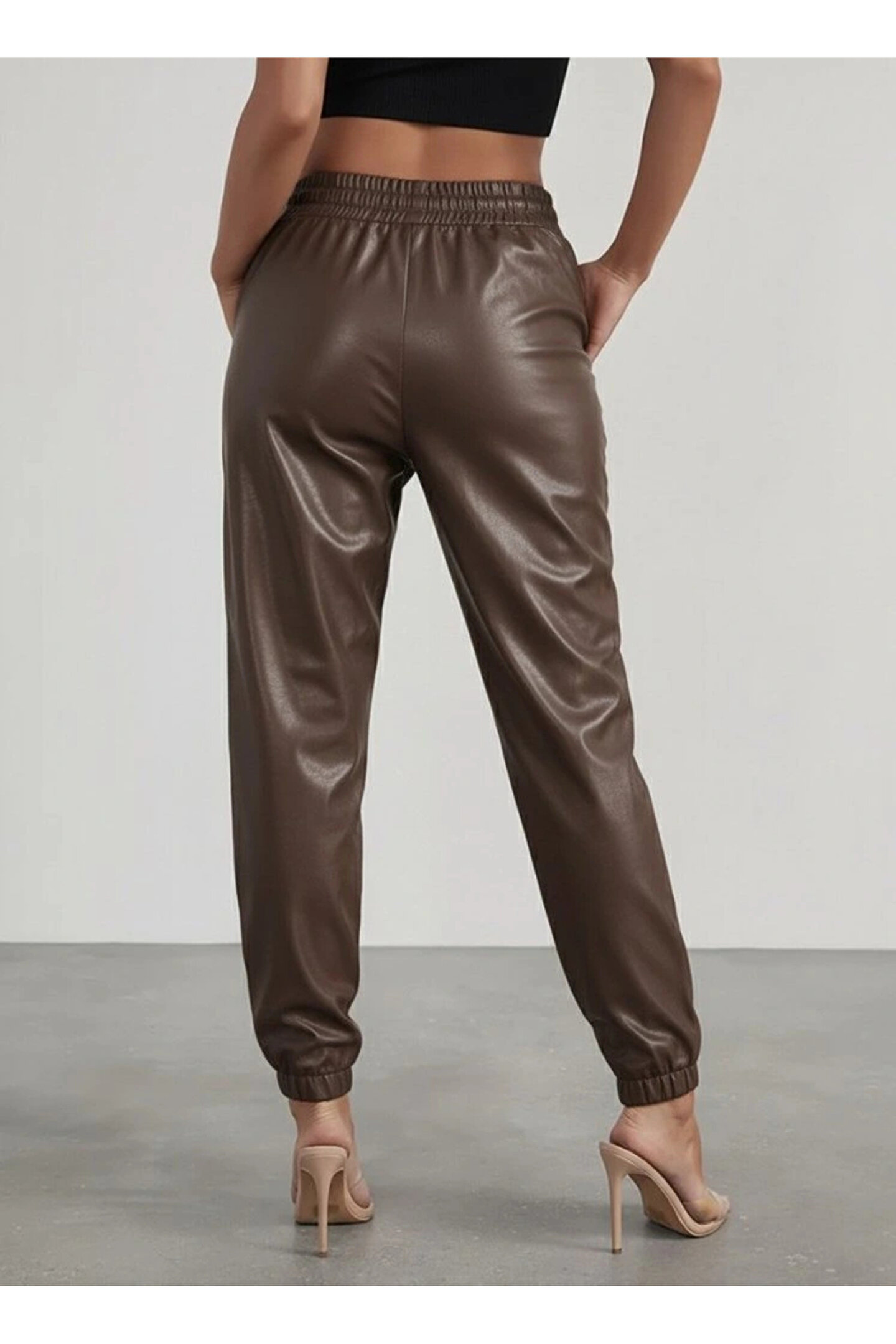 Kadın Yüksek Bel Lastikli önü Düğmeli Deri Pantolon