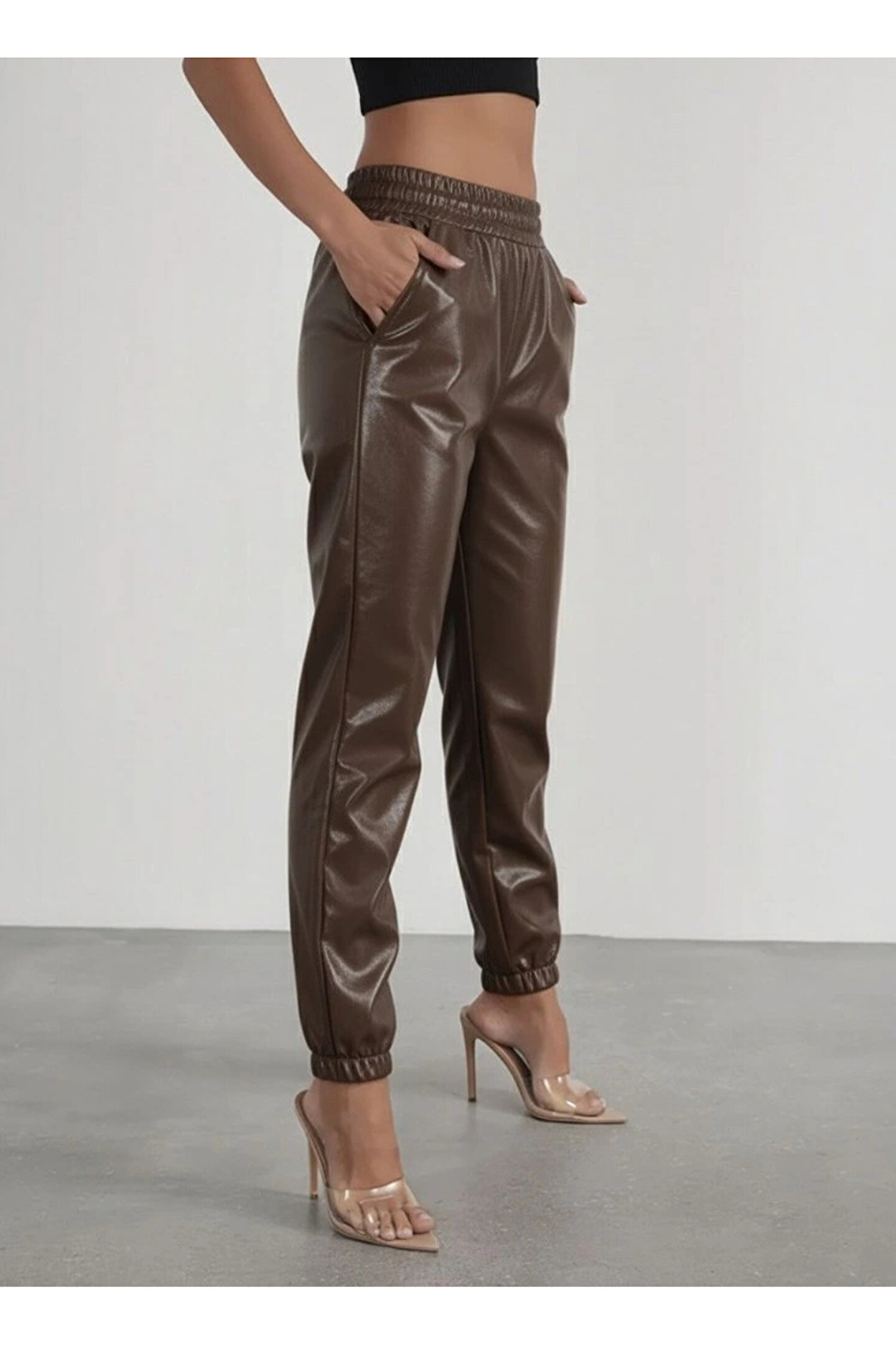 Silerra Kadın Yüksek Bel Lastikli önü Düğmeli Deri Pantolon