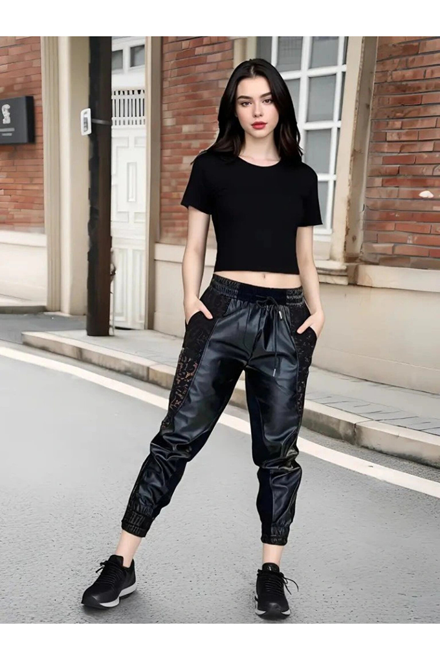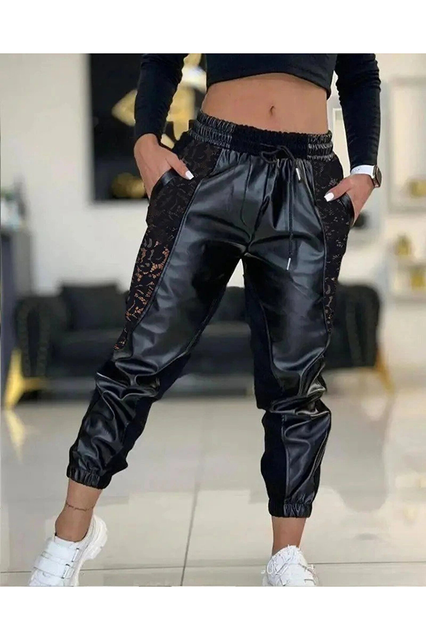 Kadın Yüksek Bel Lastikli Yanda Dantel Detaylı Bağcıklı Deri Pantolon