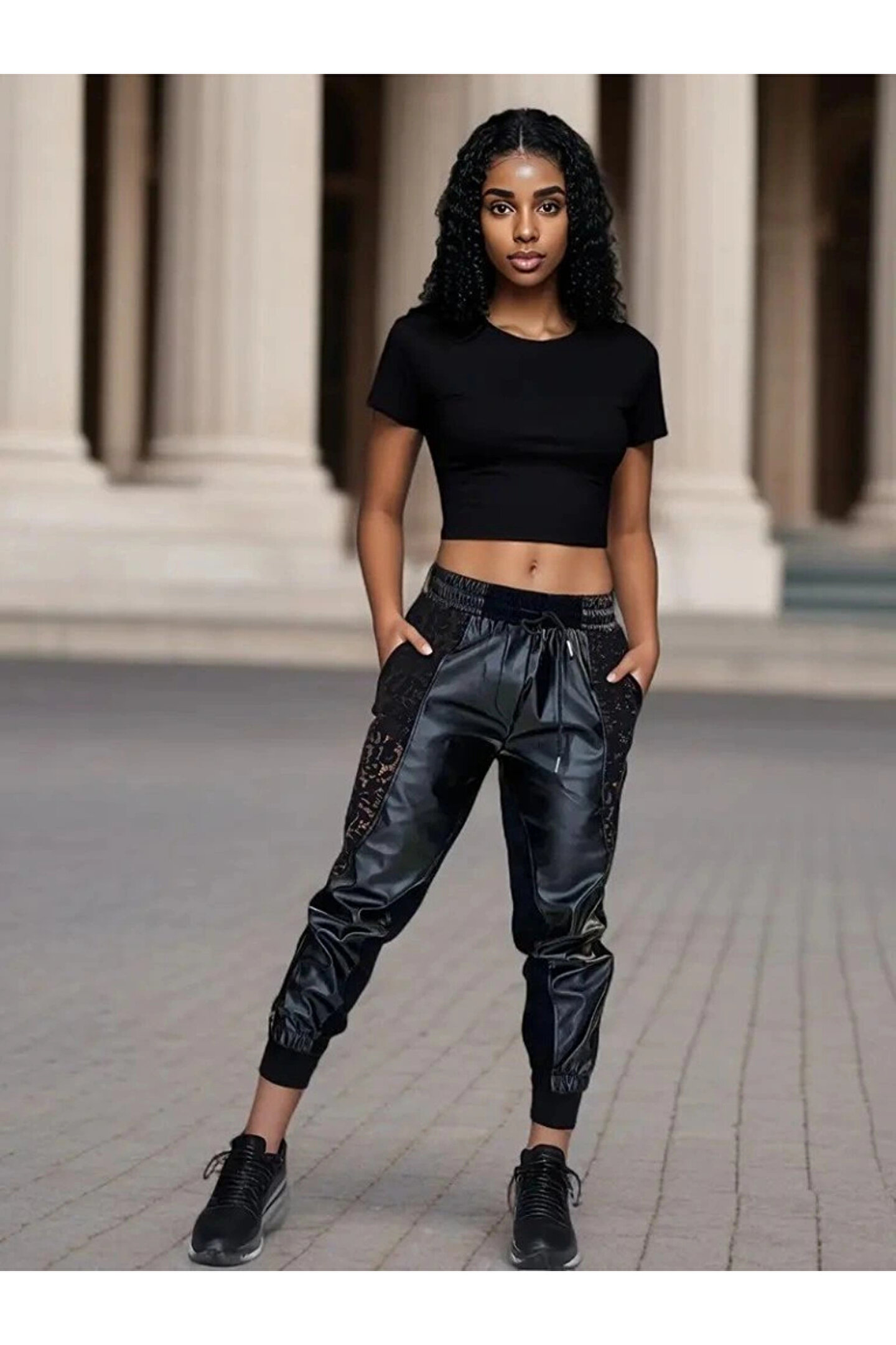 Kadın Yüksek Bel Lastikli Yanda Dantel Detaylı Bağcıklı Deri Pantolon