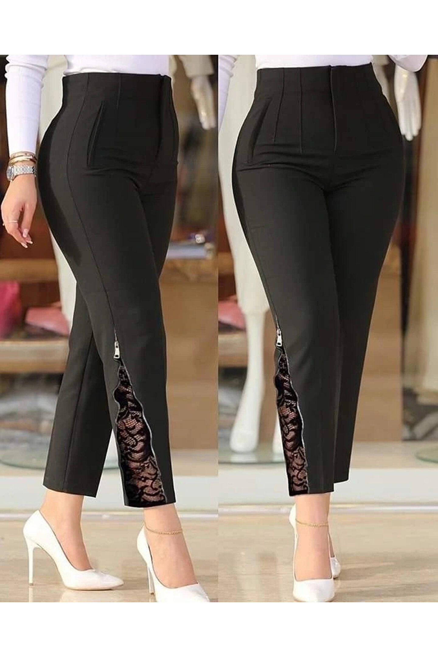 Kadın Yüksek Bel önden Nervürlü Ve Fermuarlı Yandan Dantelli Ithal Krep Pantolon