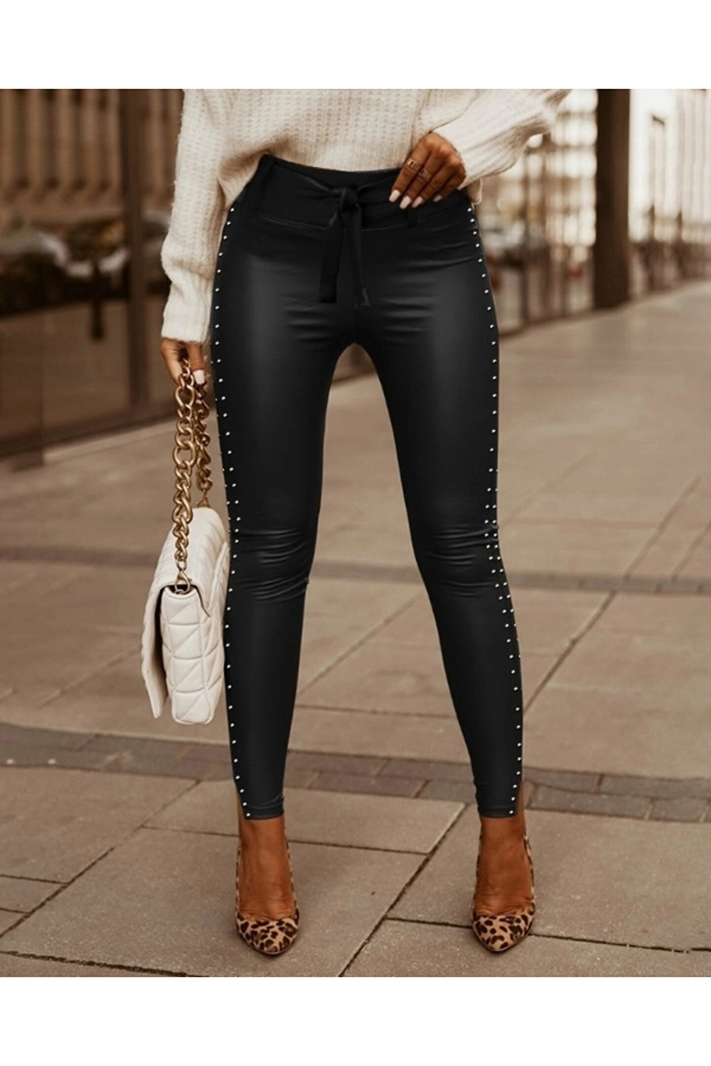 Kadın Yüksek Bel Yanlardan Incili Yırtmaçlı Uzun Deri Tayt