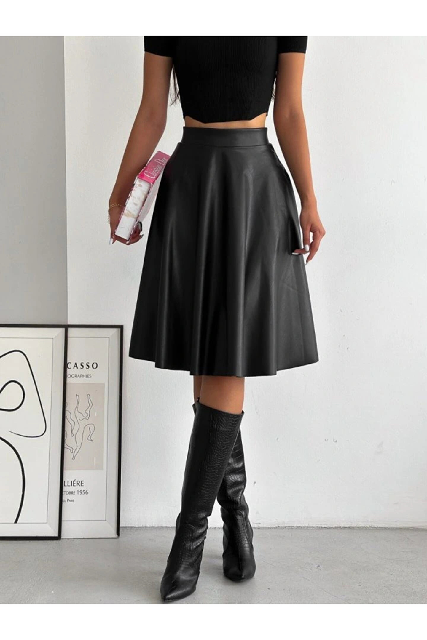 Silerra Kadın Yüksel Bel Deri Kloş Etek
