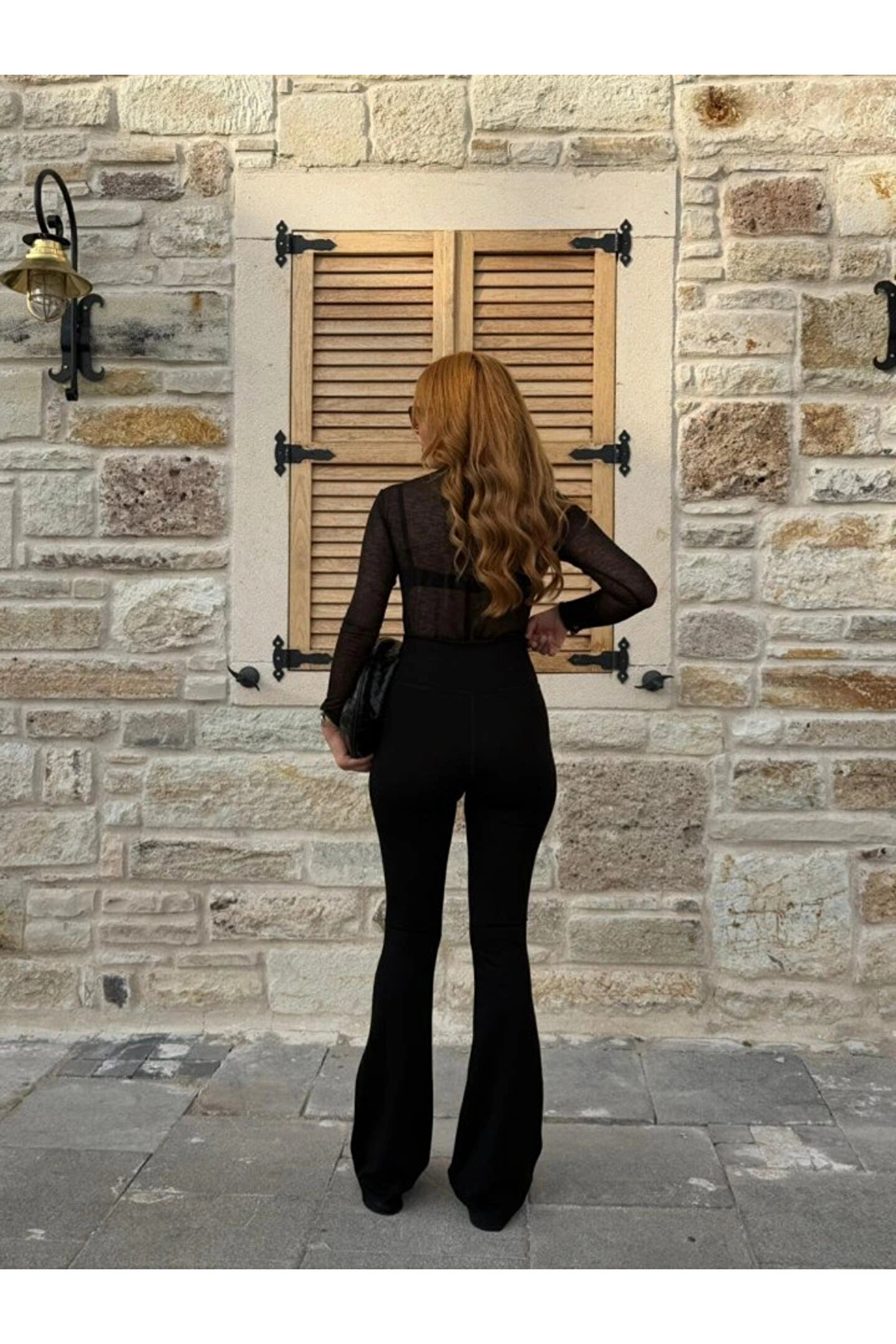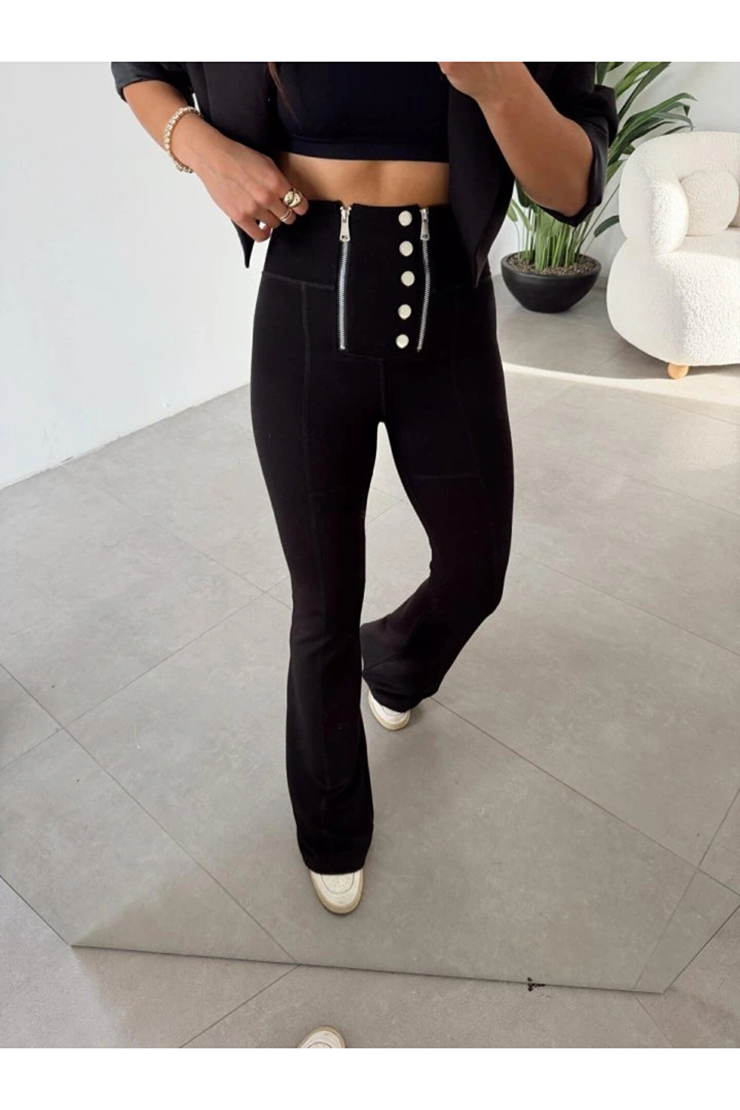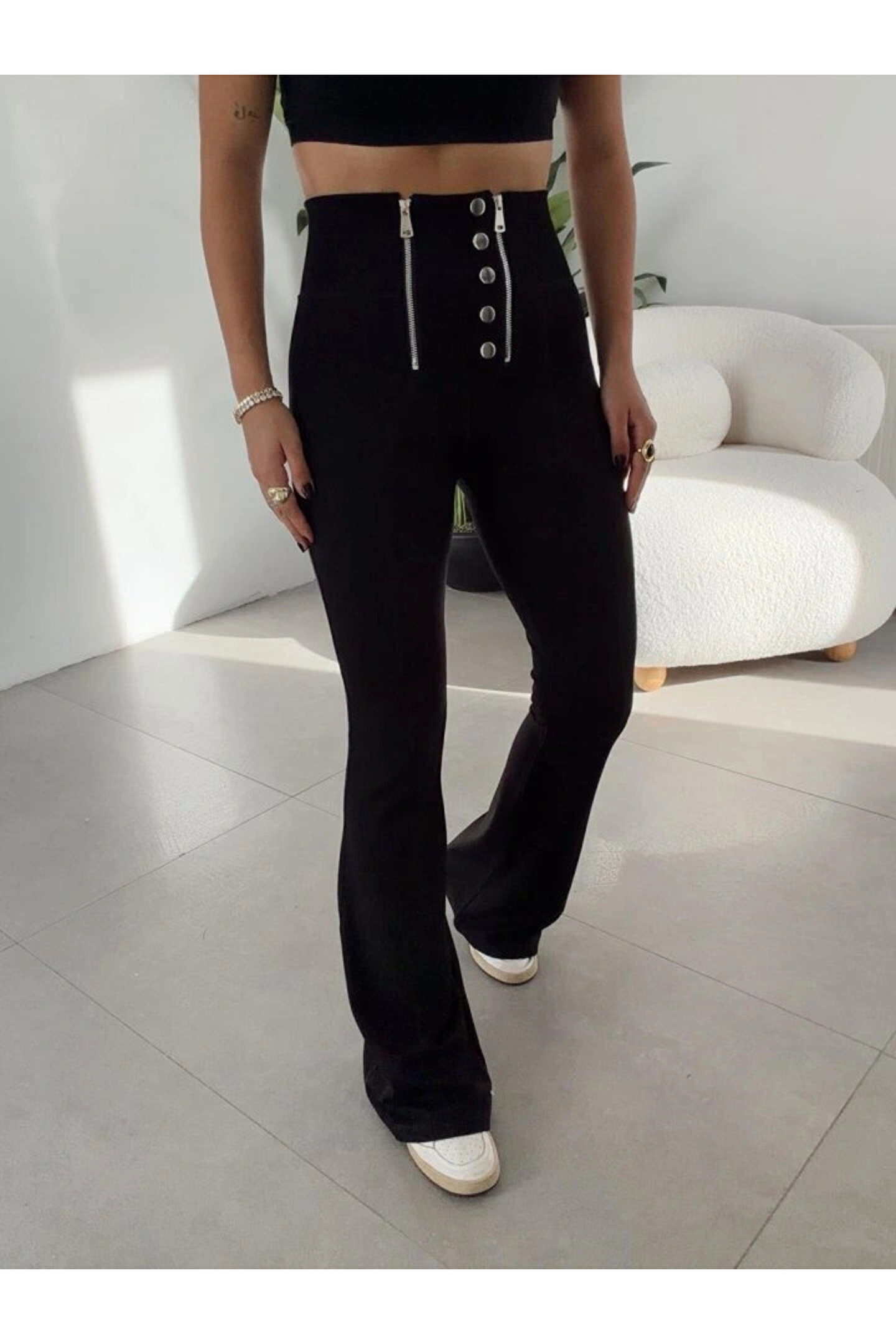 Kadın Yüksel Bel Düğme Ve Fermuar Detay çelik Kumaş Ispanyol Paça Tayt
