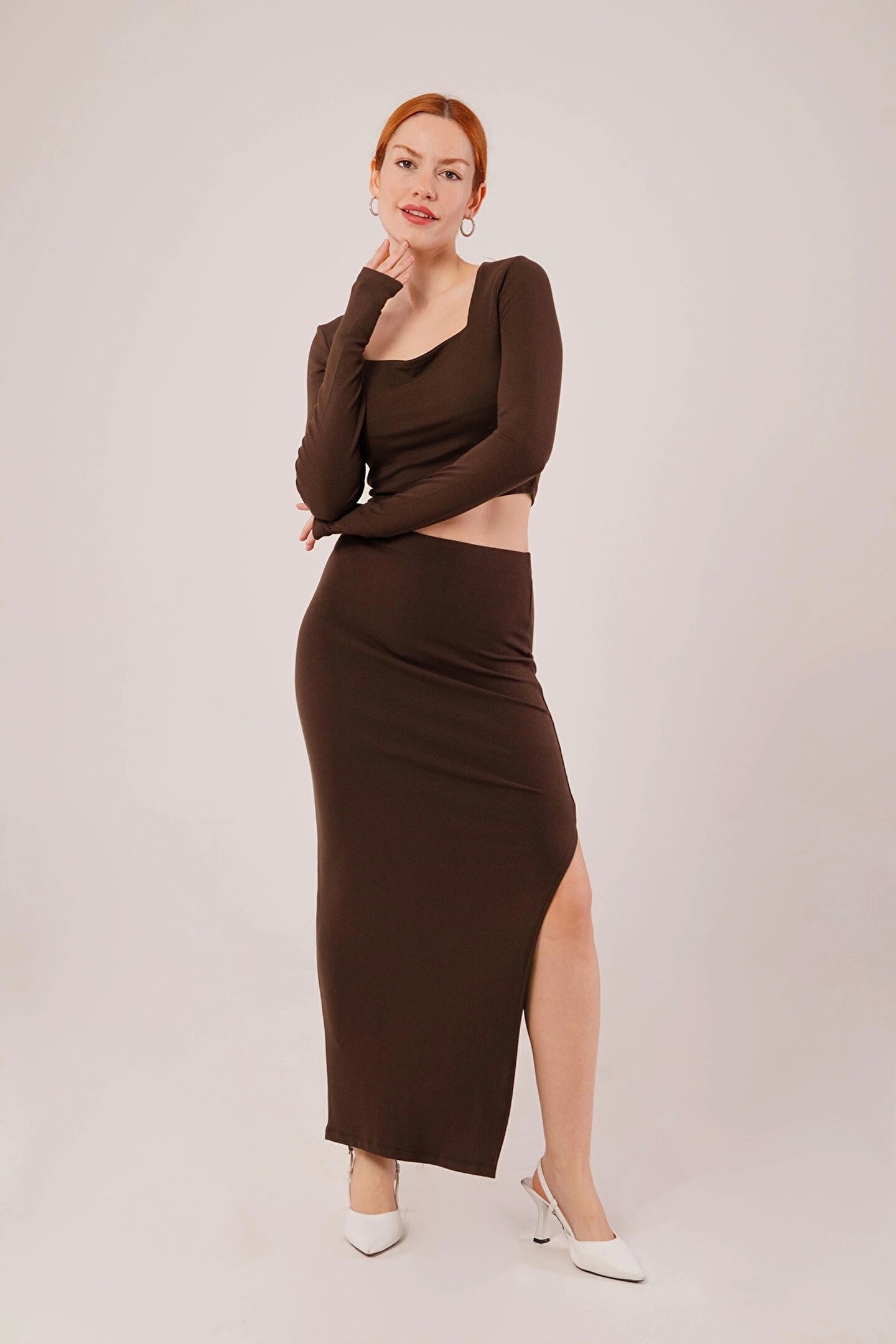 Kare Yaka Bluz Ve Yırtmaç Detaylı Etek İkili Kahverengi Takım