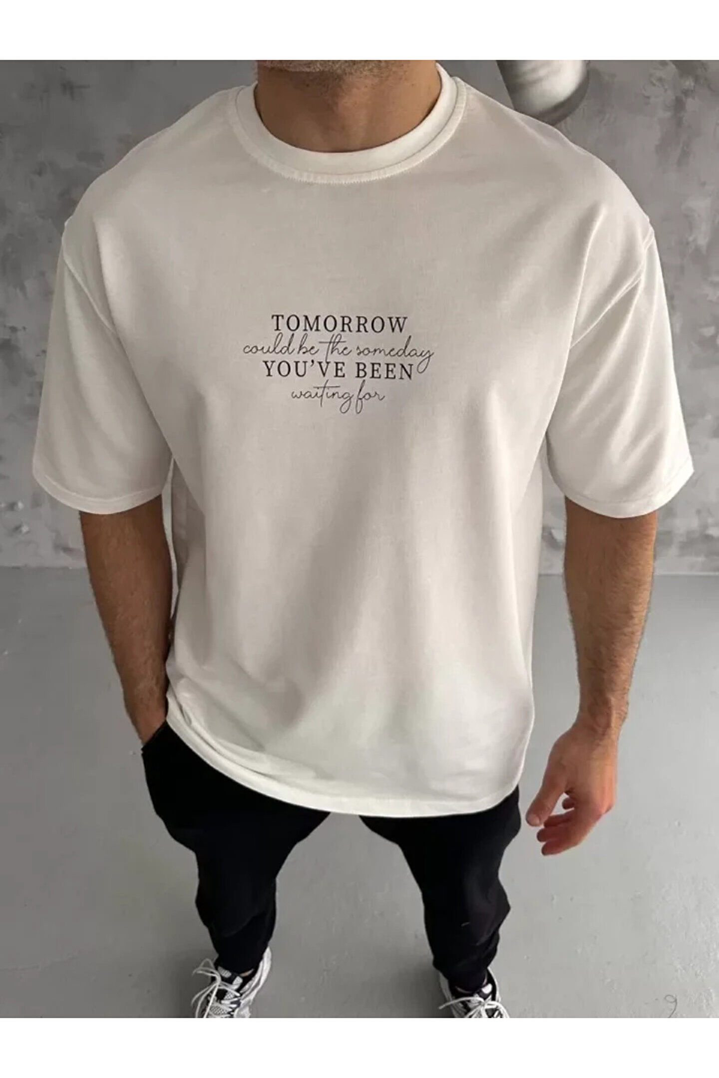 Kendim Fashion Unisex Bisiklet Yaka Baskılı Oversize T-Shirt - Beyaz