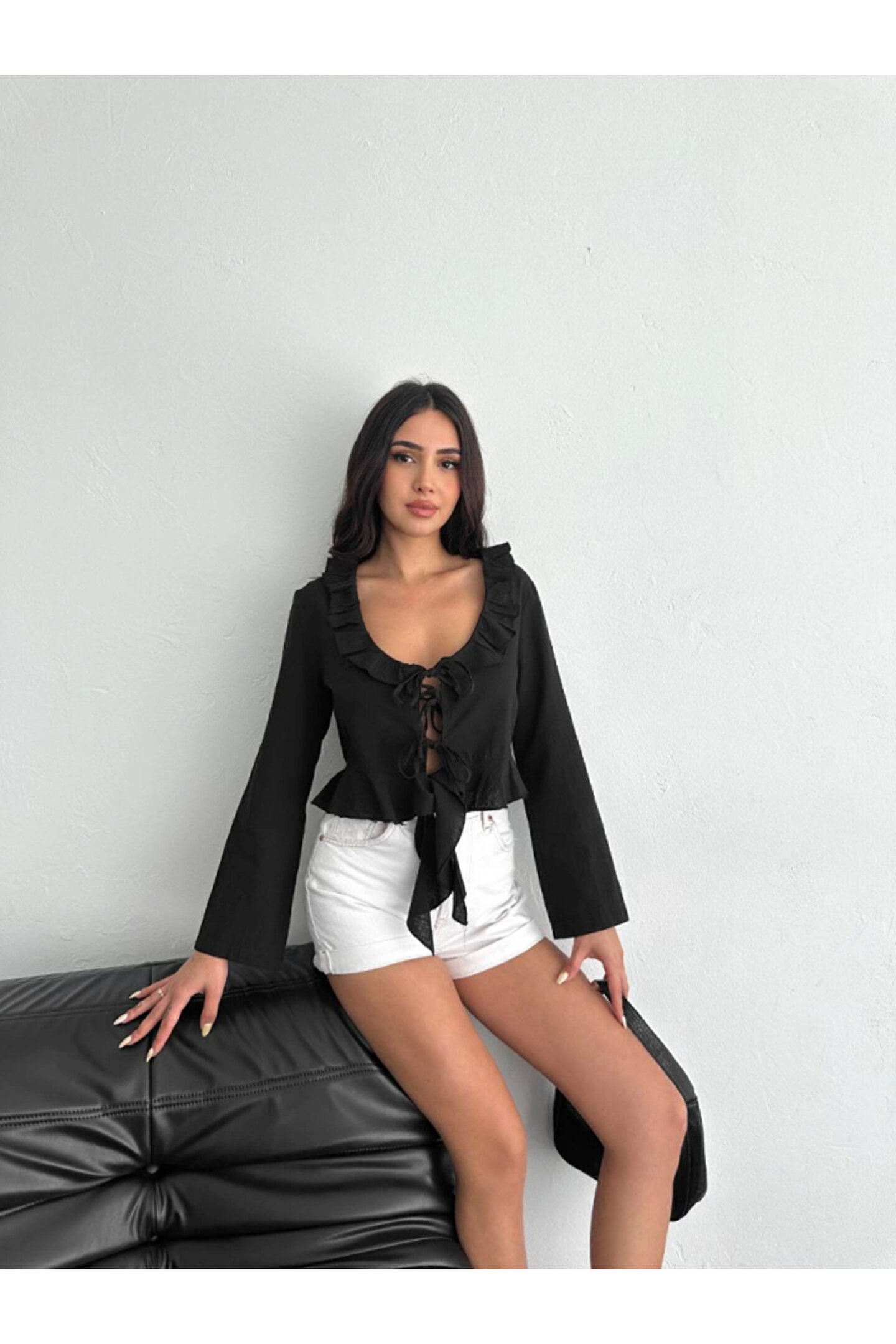 Keten Uzun Kol Bağacık Detaylı Bluz - Siyah