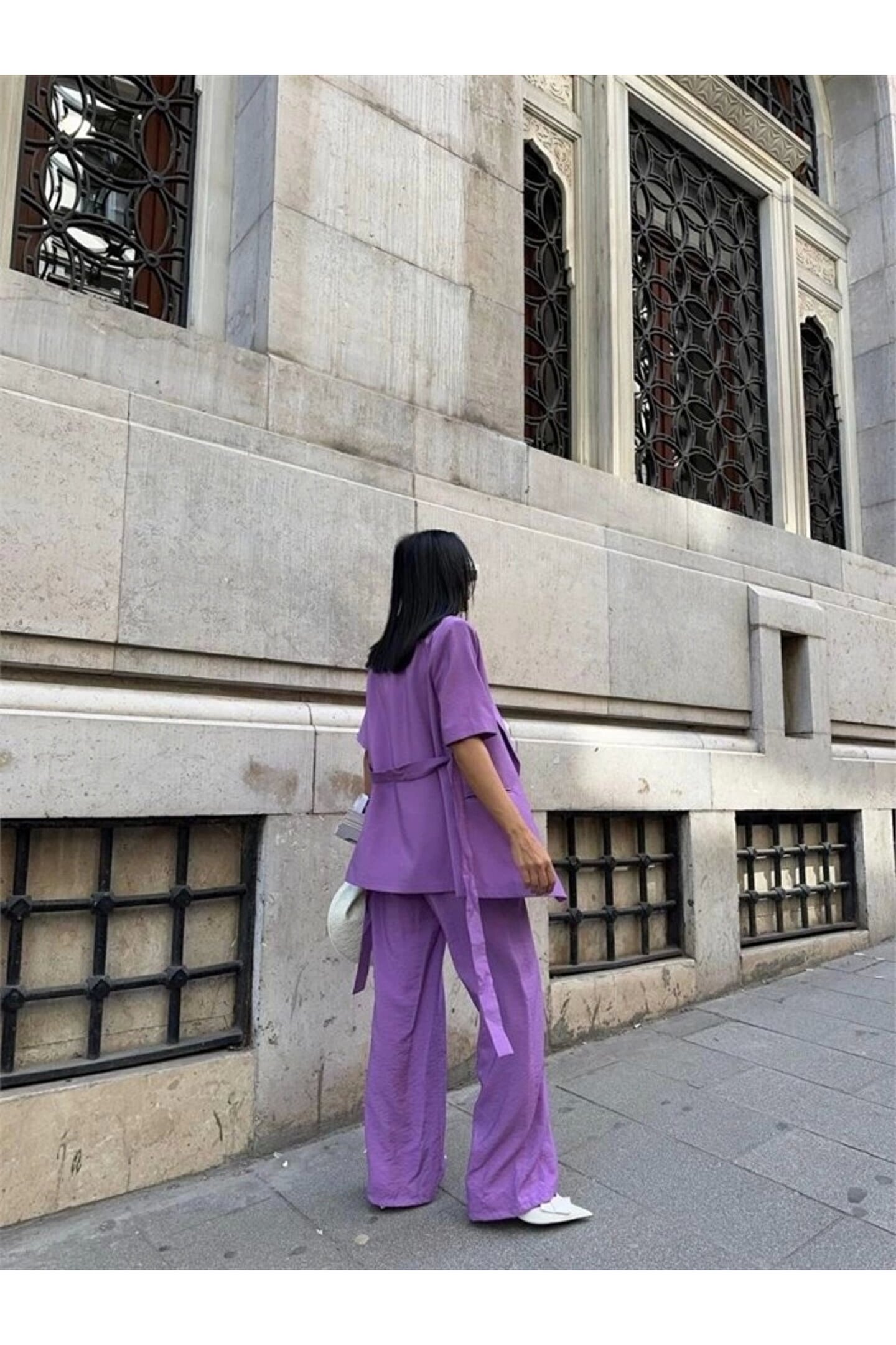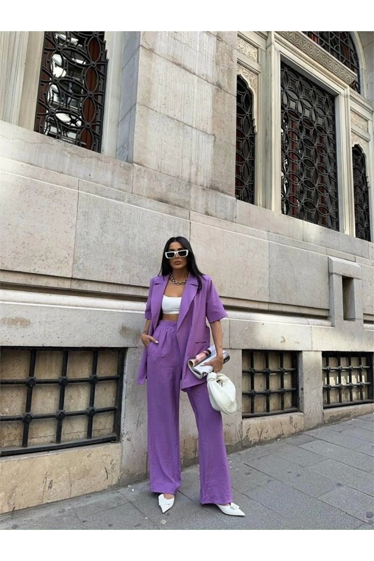 KISA KOL BAĞLAMA DETAYLI CEKET-PANTOLON TAKIM - Mor