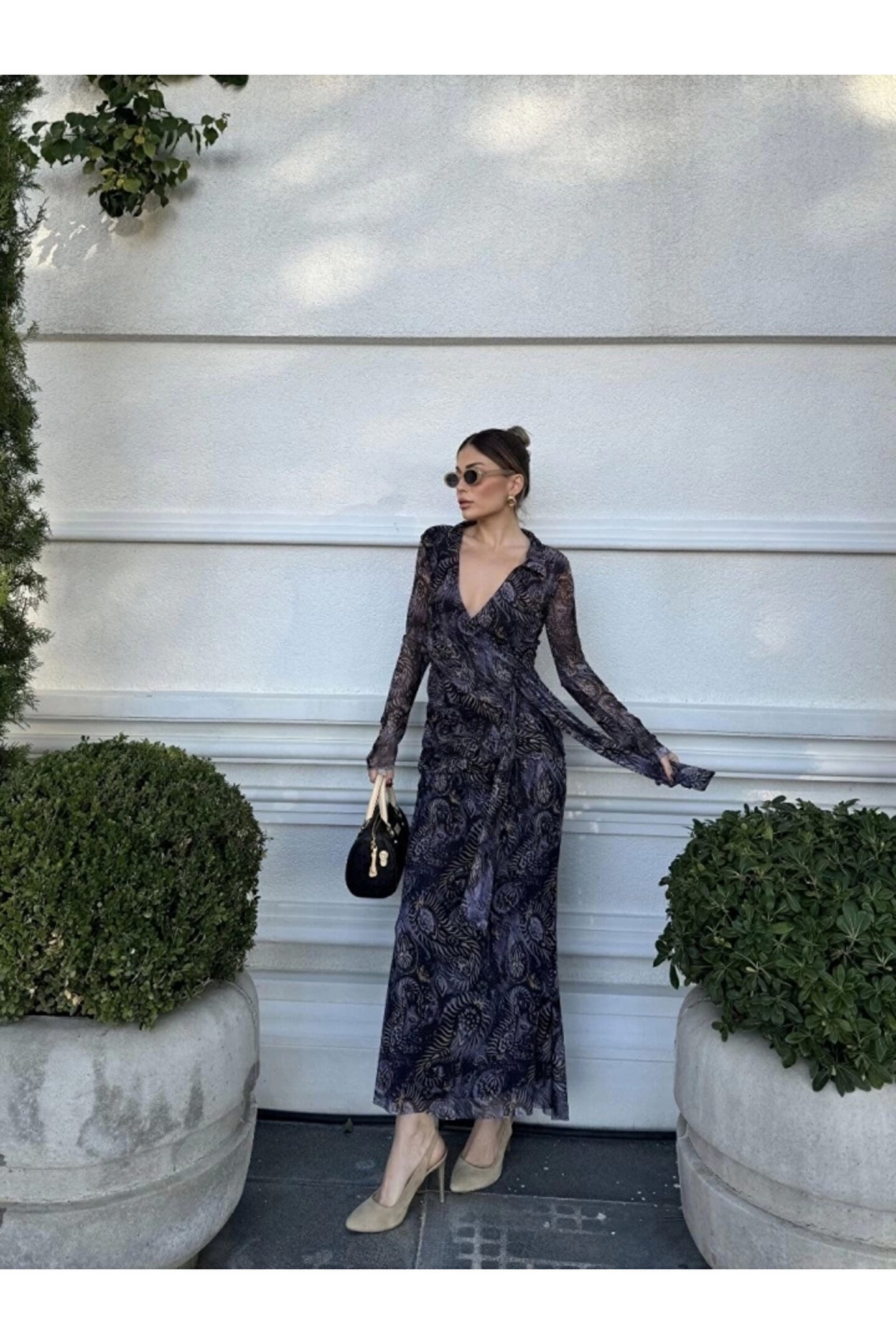 Silerra Kruvaze V Yaka, Fırfırlı Ve Bağcıklı Desenli Bluz Ve idi Etek Takım iyah