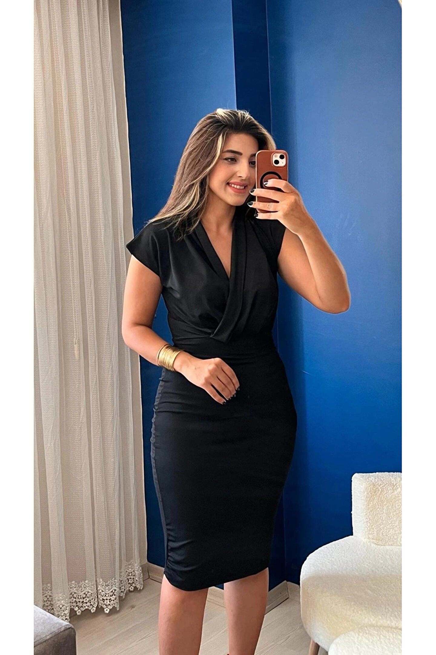 Silerra MDB Kadın Kısa Kollu Kruvaze Yaka Krep Elbise (Kemersiz)