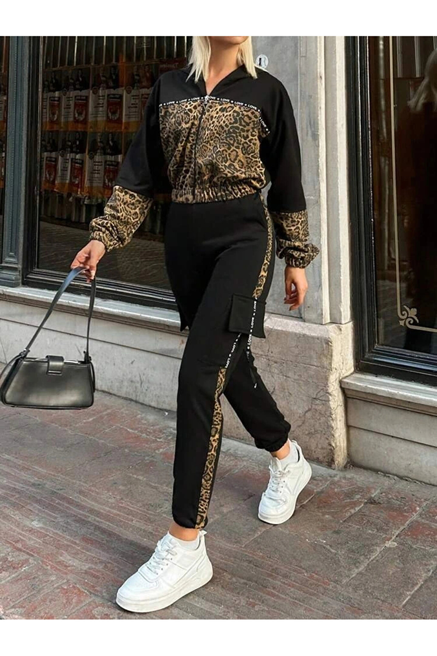 MDB Kadın Uzun Kollu Kapşonlu Leopar Desenli Viskon Iki Iplik Bluz Ve Pantolon Ikili Takım