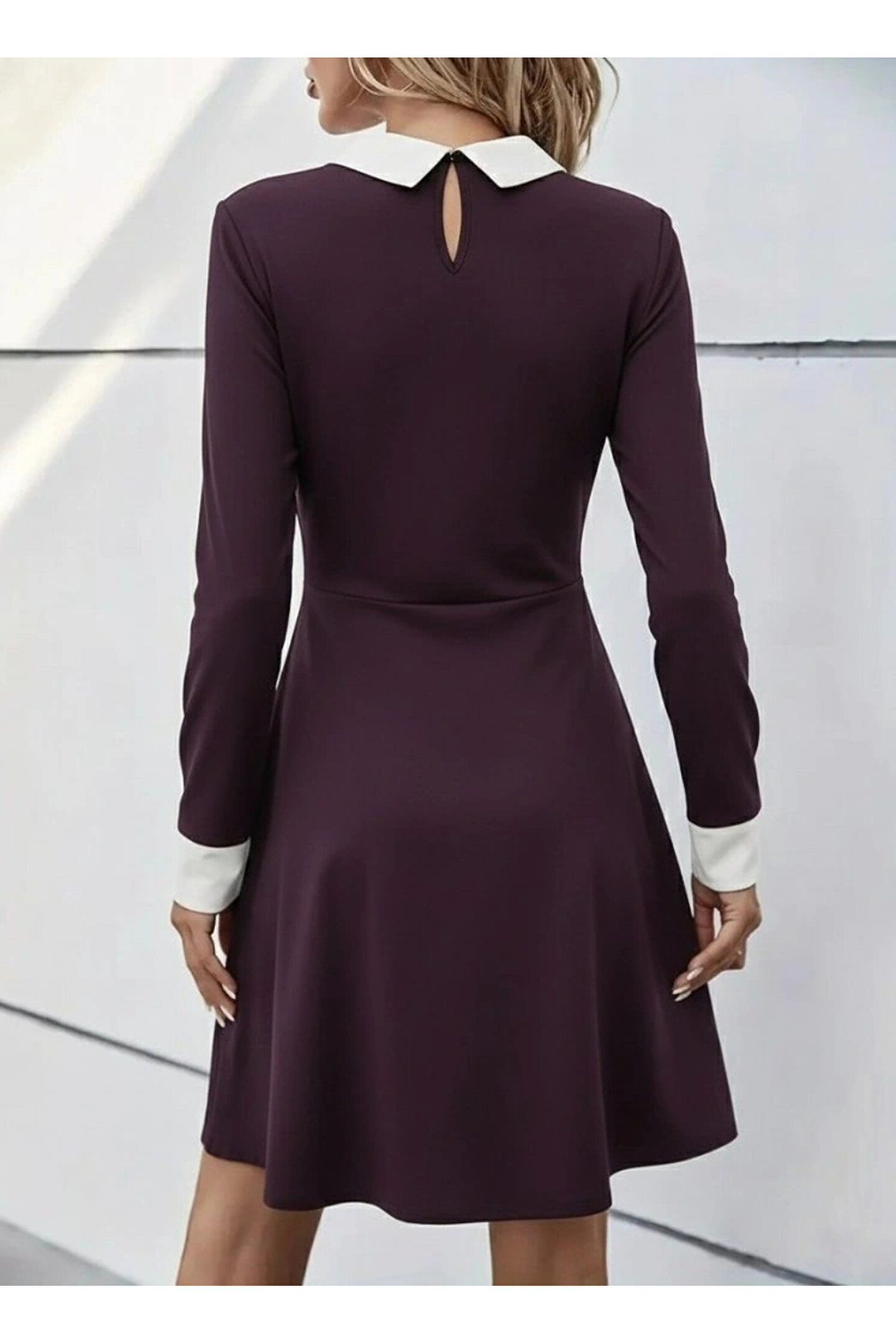Kadın Uzun Kollu Yakalı Düğmeli Mürdüm Modal Mini Elbise