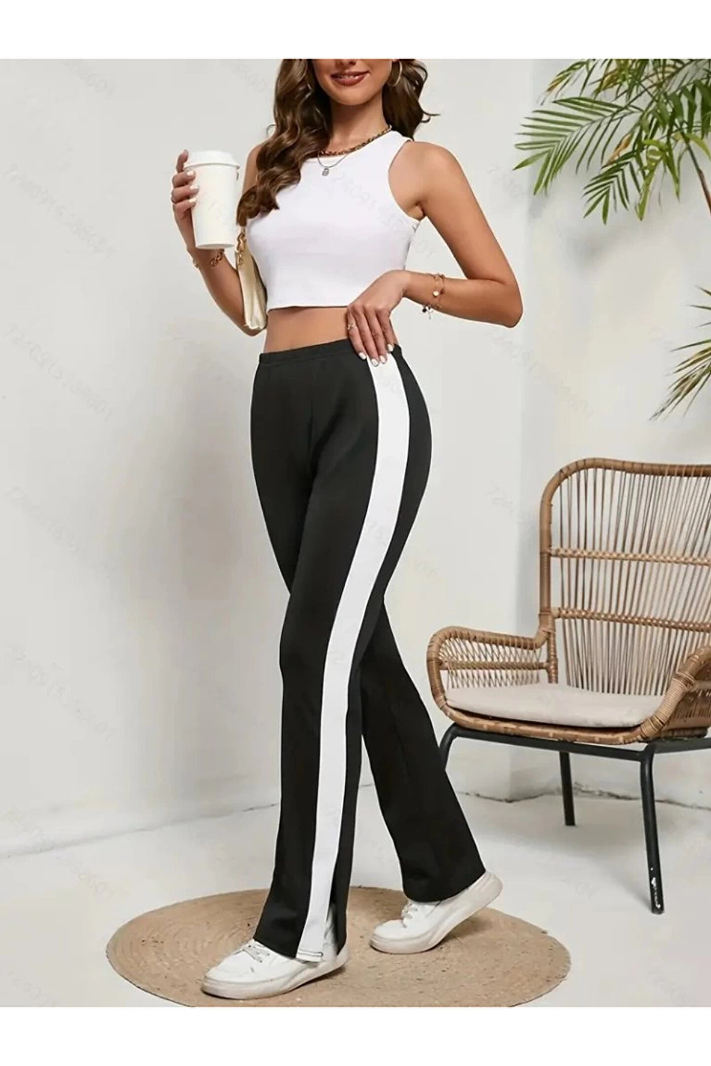 MDB Kadın Yüksek Bel Yan şerit Detaylı Yırtmaçlı Viskon Iki Iplik Pantolon