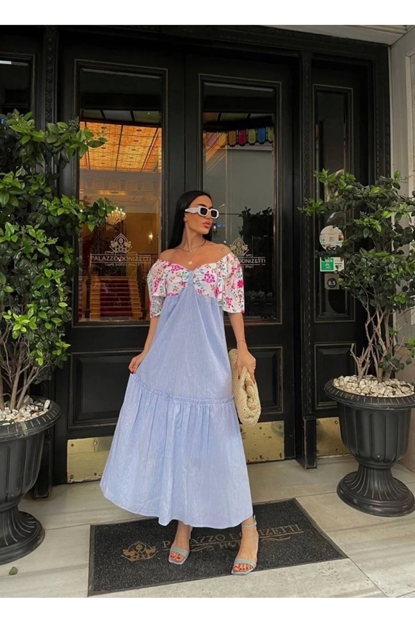 RENKLİ NAKIŞ DESENLİ ELBİSE - Mavi