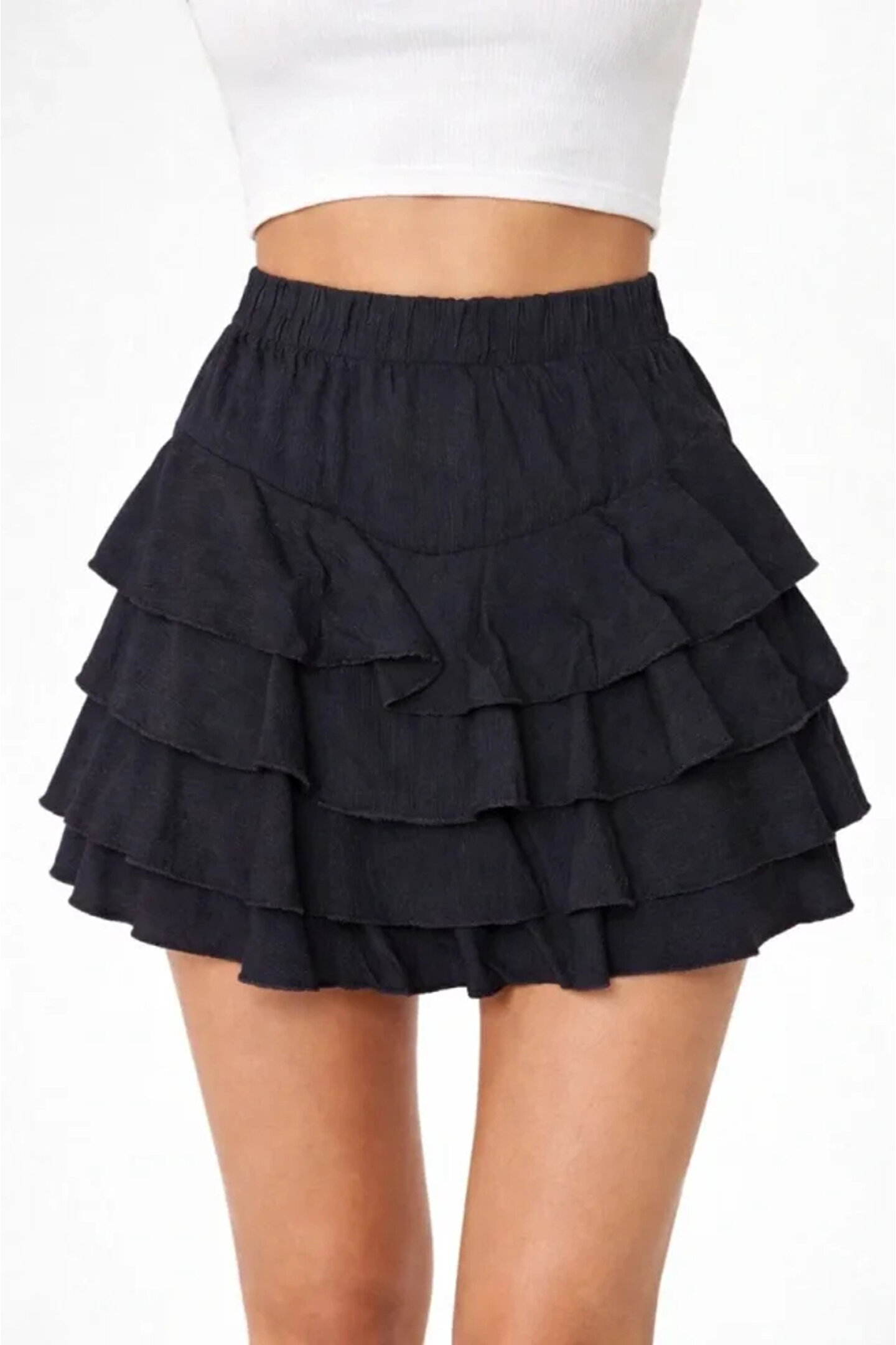 Siyah Katlı Mini Fırfıtlı Etek Lastikli Yüksel Bel, Volanlı Tasarım, Rahat Kalıp, Günlük Ve Şık Komb