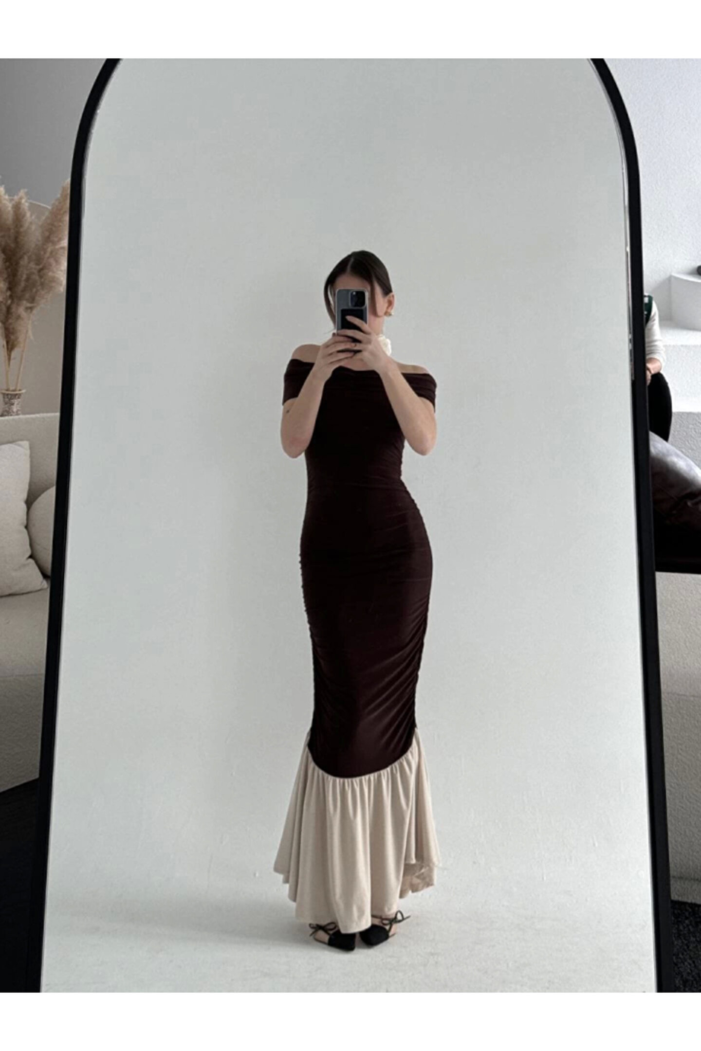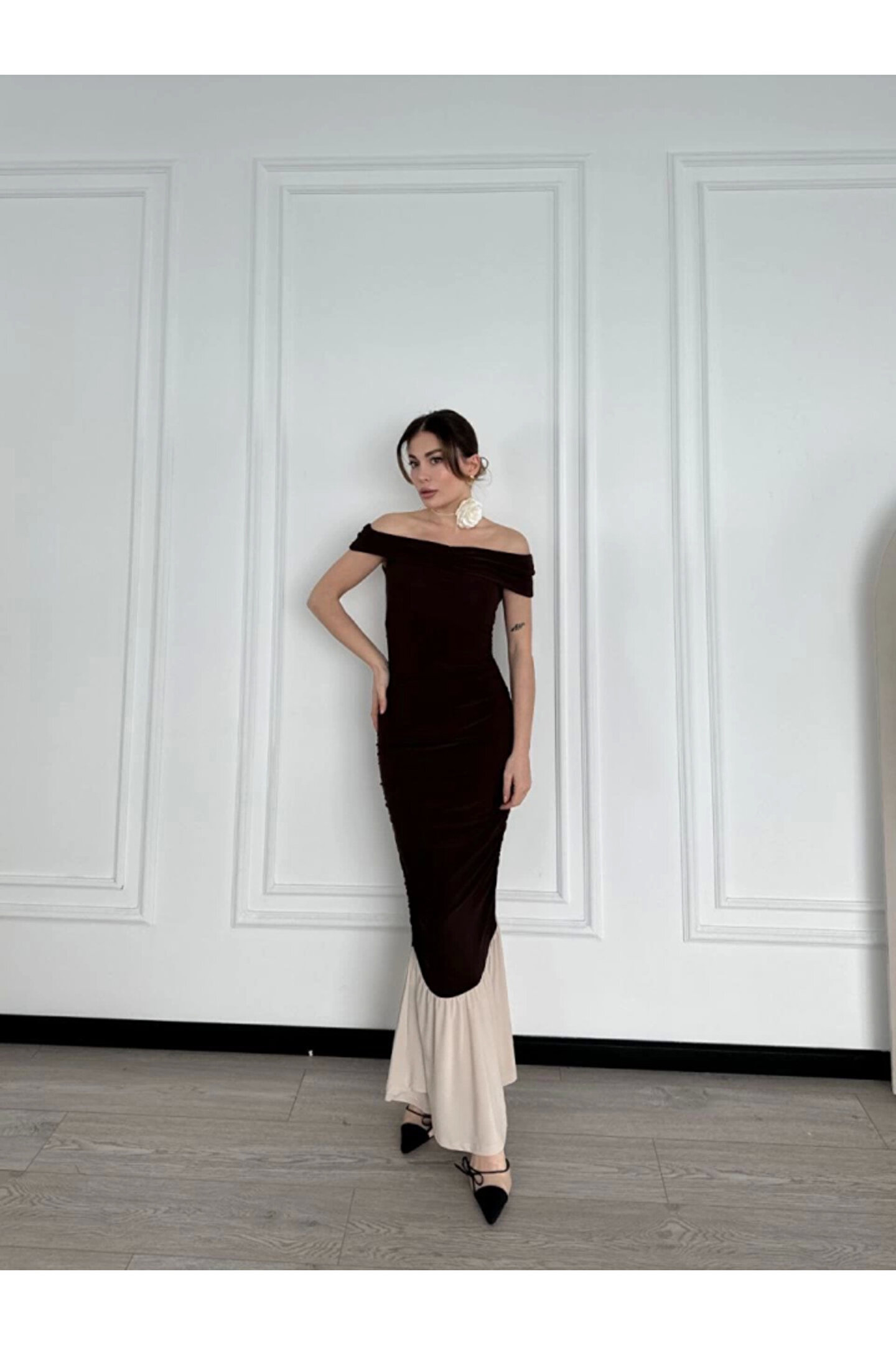 Silerra Striptiz Omuzlu Uzun Elbise- Kahve