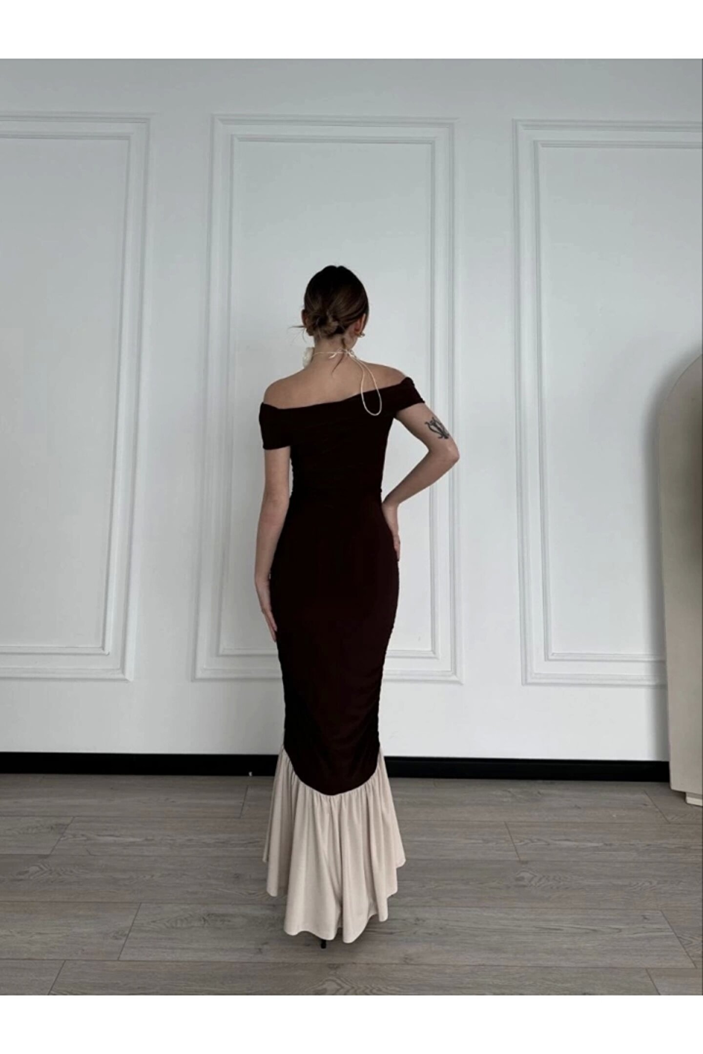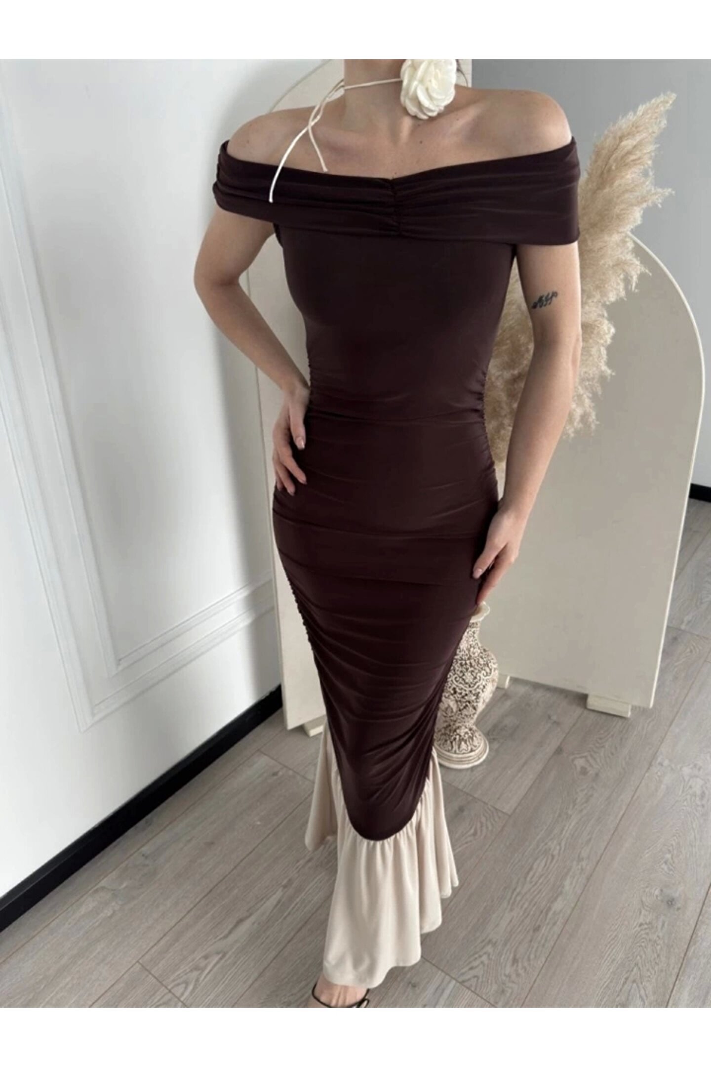 Silerra triptiz Omuzlu Uzun Elbise Kahve