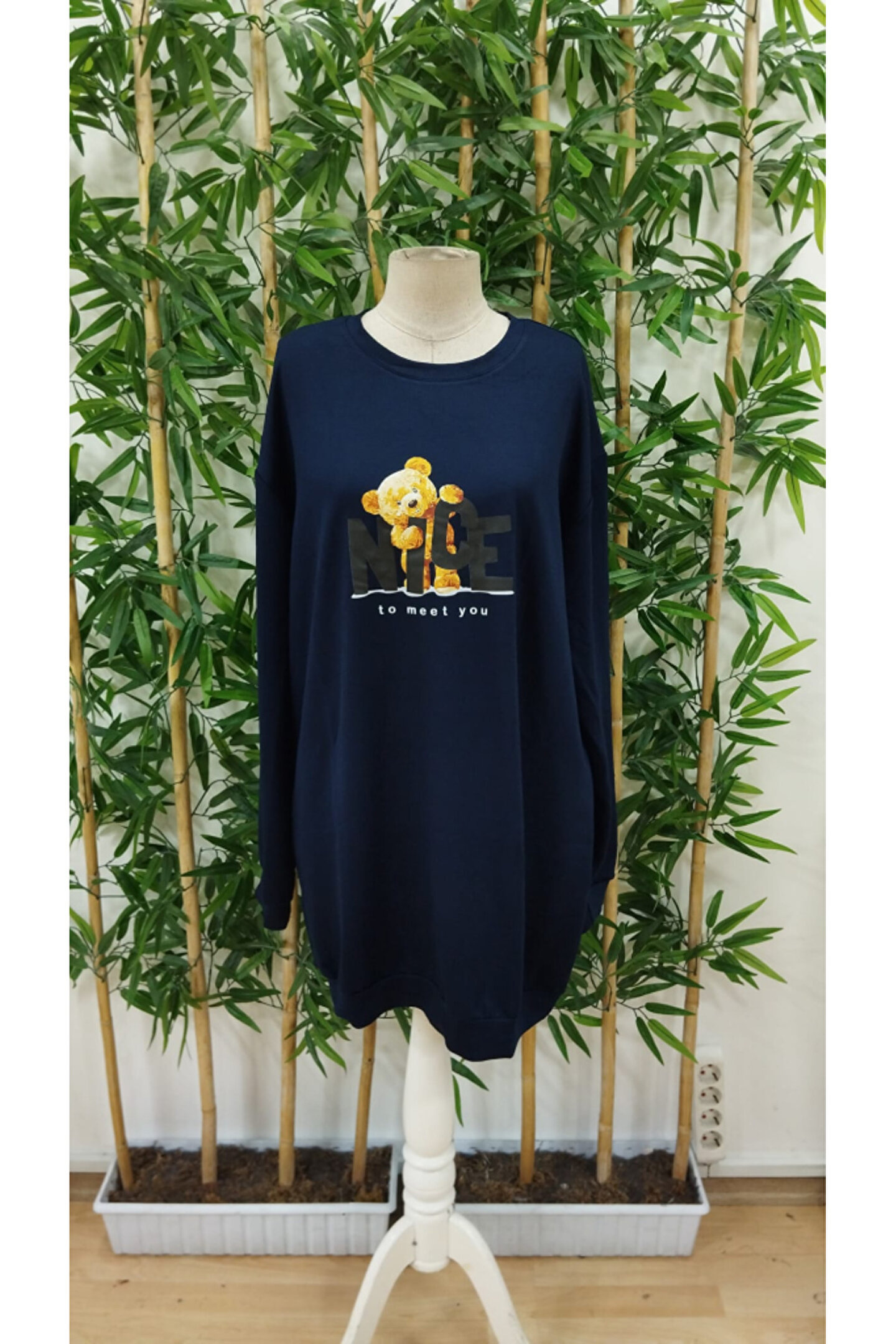 Turega Style Kadın Uzun Kollu Bisiklet Yaka Ayı Desenli Viskon Iki Iplik Elbise