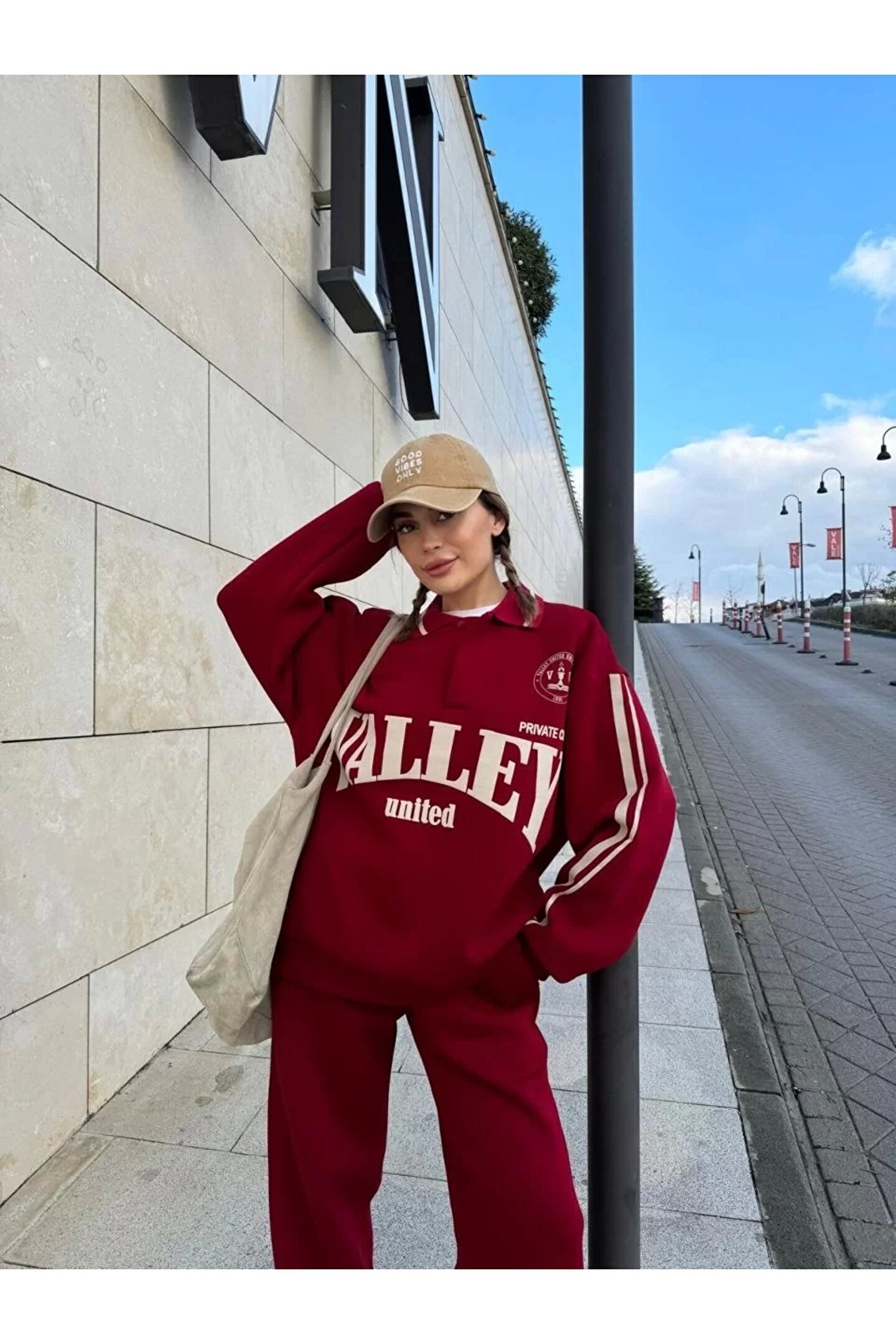 Silerra Üç İplik Yakalı Sweat Baggy Pantalonlu Takım - Bordo