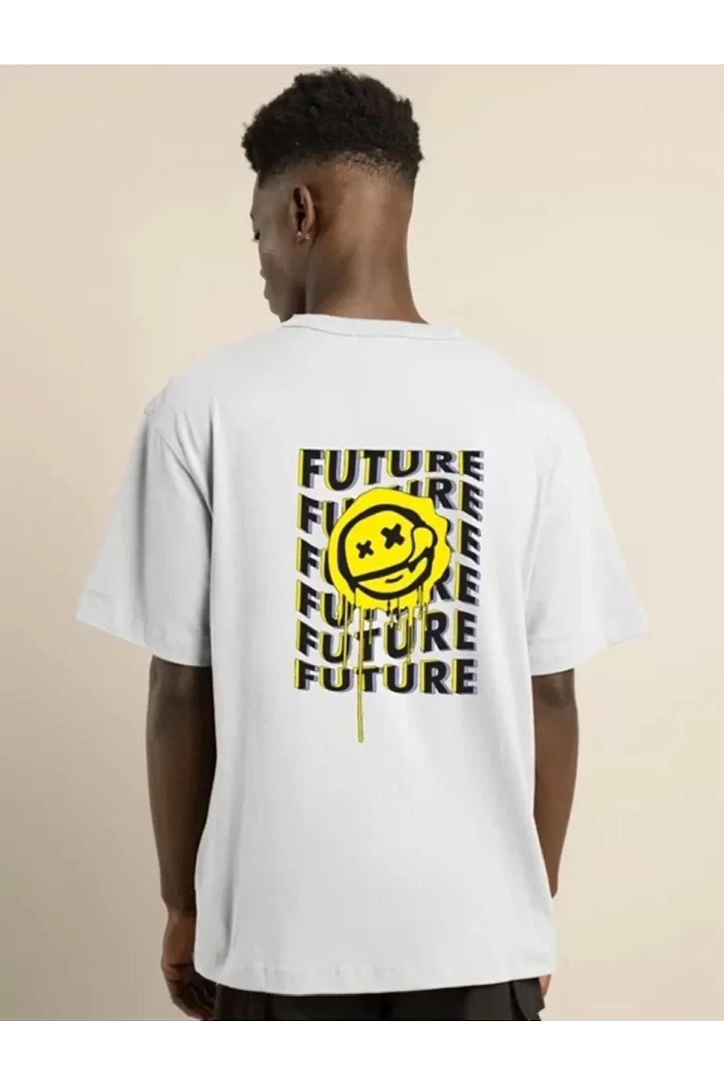 Unisex Bisiklet Yaka Baskılı Oversize T-Shirt - Beyaz