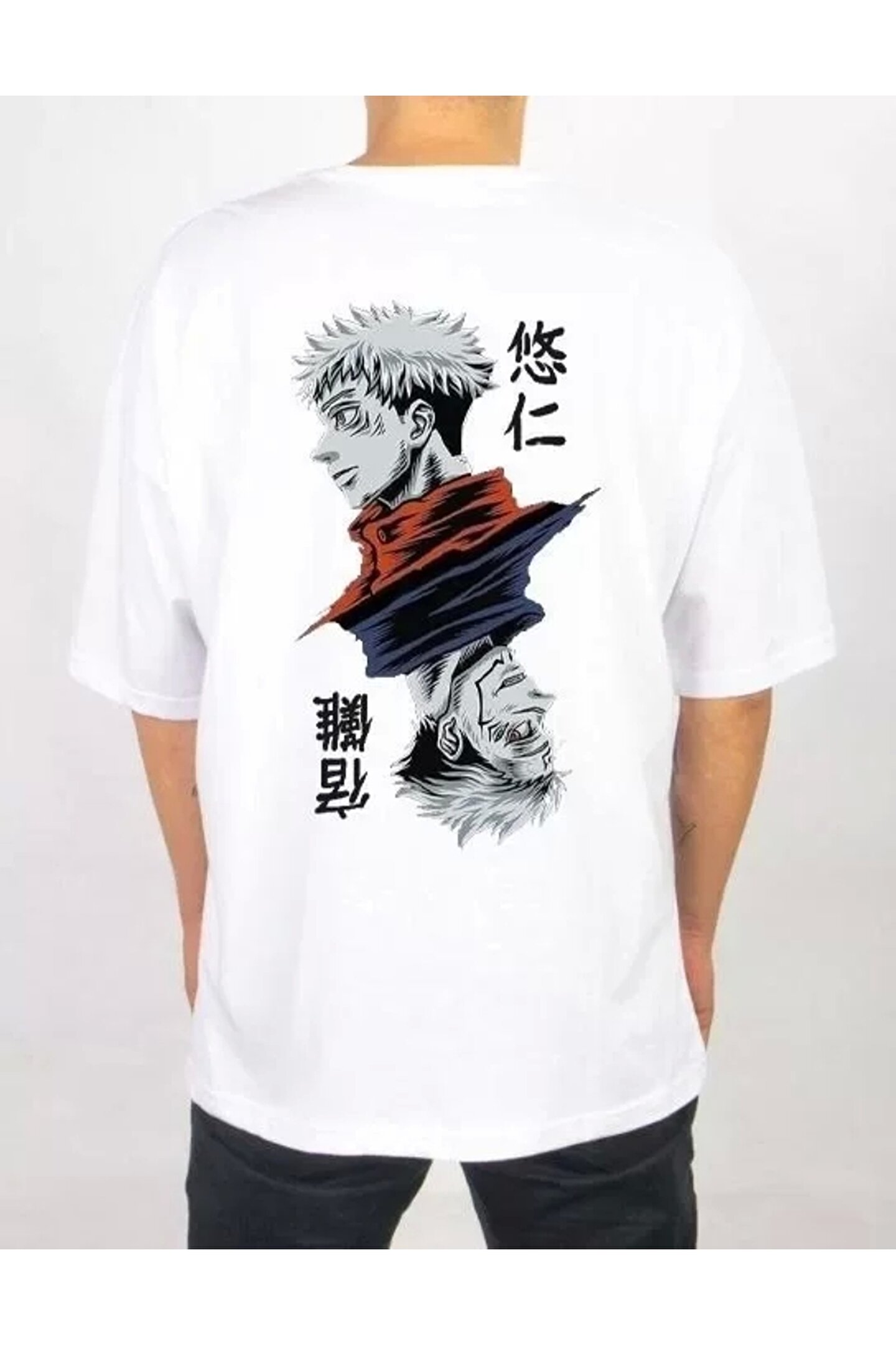 Unisex Bisiklet Yaka Baskılı Oversize T-Shirt - Beyaz