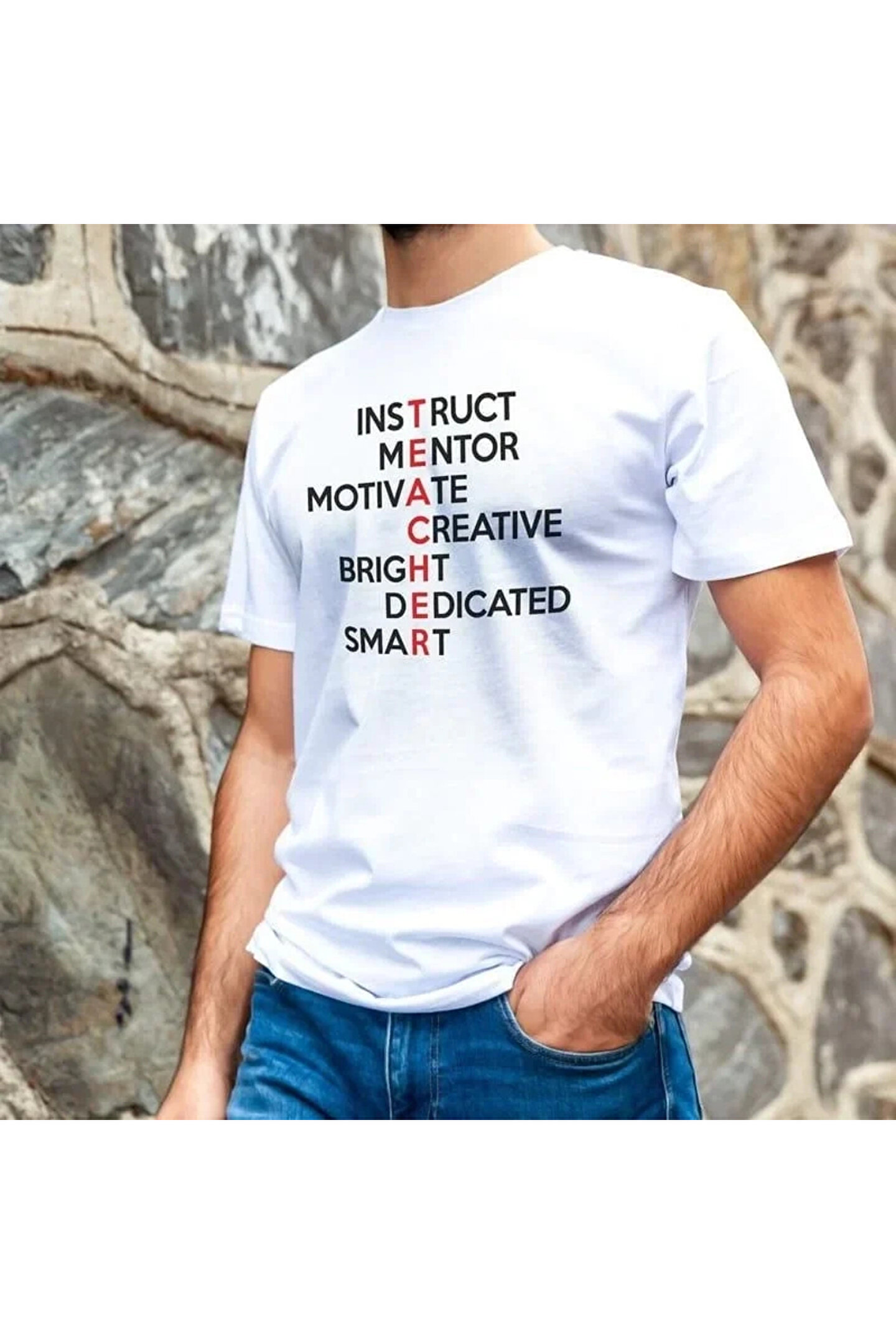 Unisex Bisiklet Yaka Baskılı Oversize T-Shirt - Beyaz