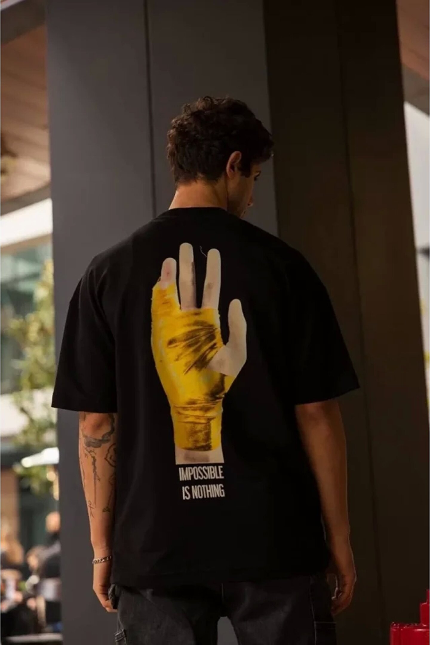 Unisex Bisiklet Yaka Baskılı Oversize T-Shirt - Siyah