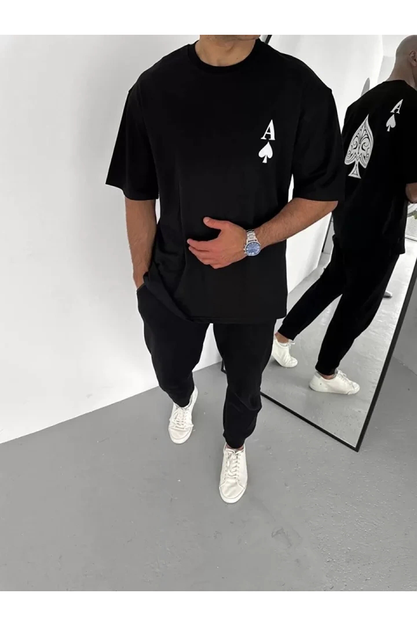 Unisex Bisiklet Yaka Baskılı Oversize T-Shirt - Siyah
