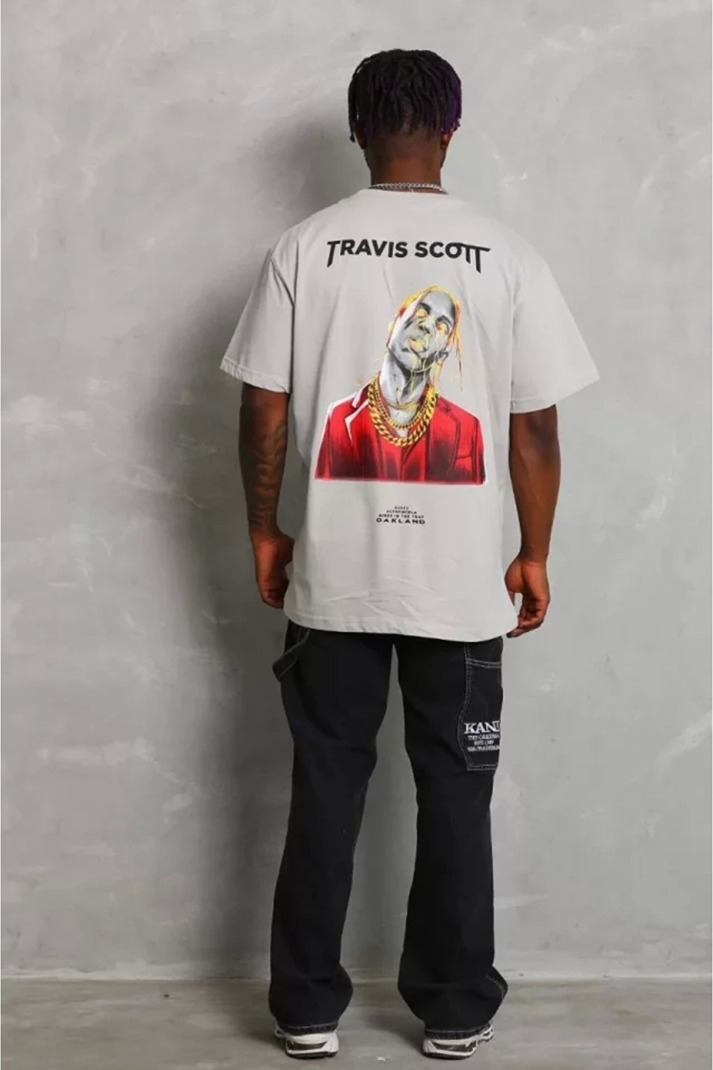 Unisex Oversize Baskılı Bisiklet Yaka T-Shirt - Gri