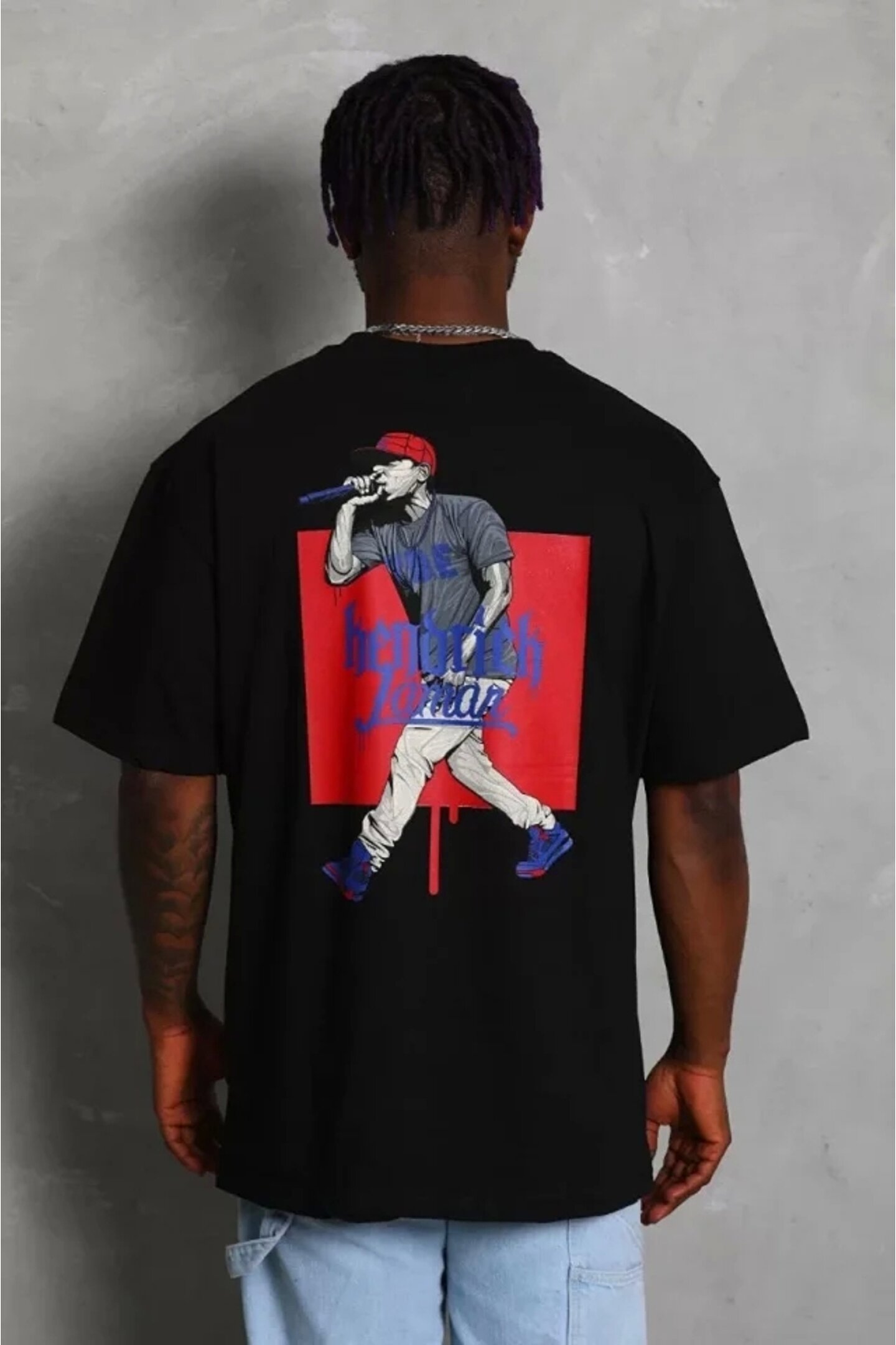 Unisex Oversize Baskılı Bisiklet Yaka T-Shirt - Siyah