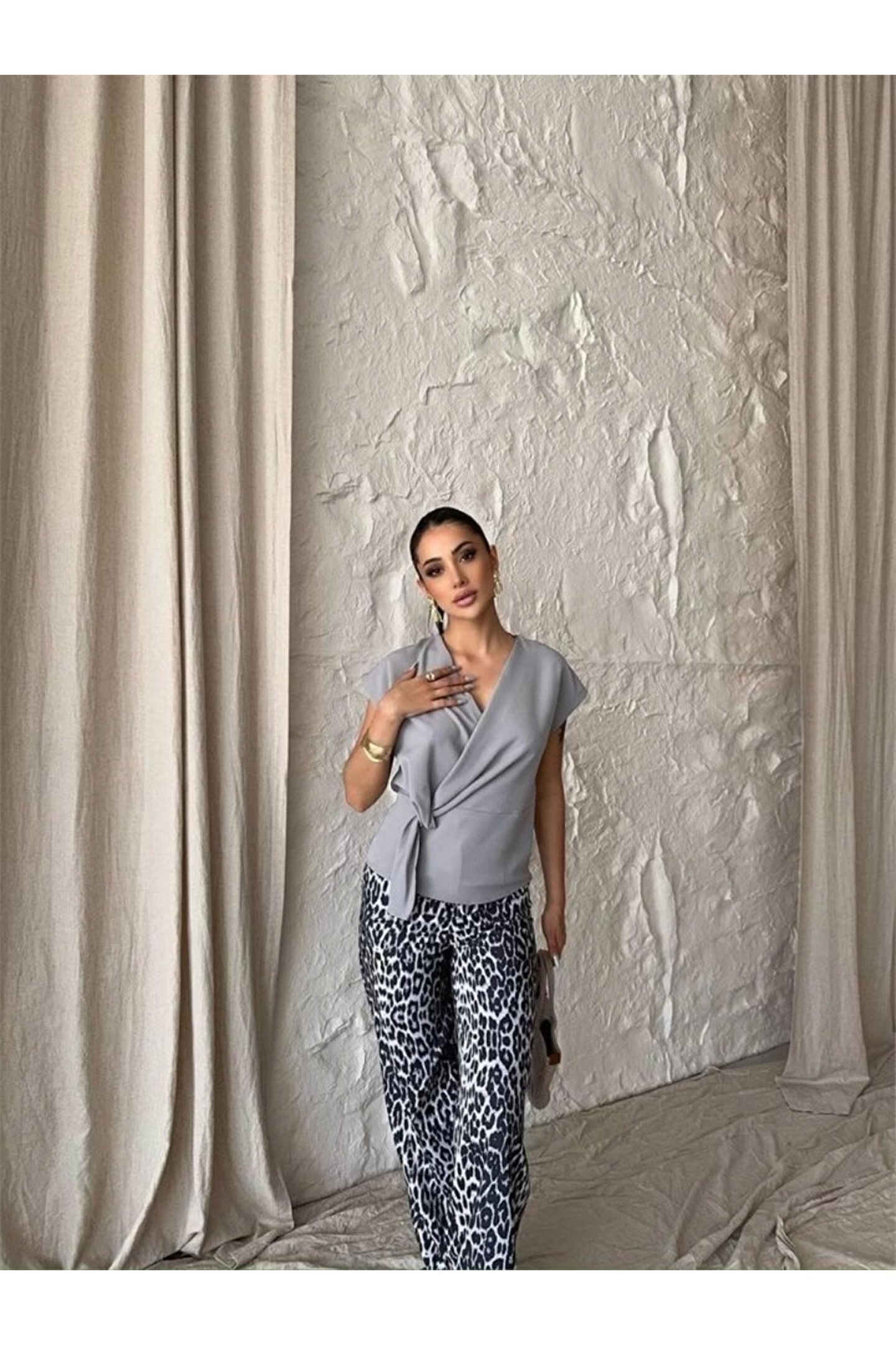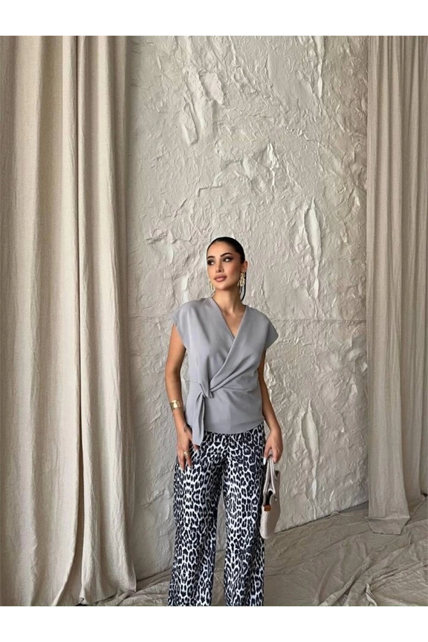 YANDAN BAĞLAMA DETAYLI KOLSUZ BLUZ - Gri