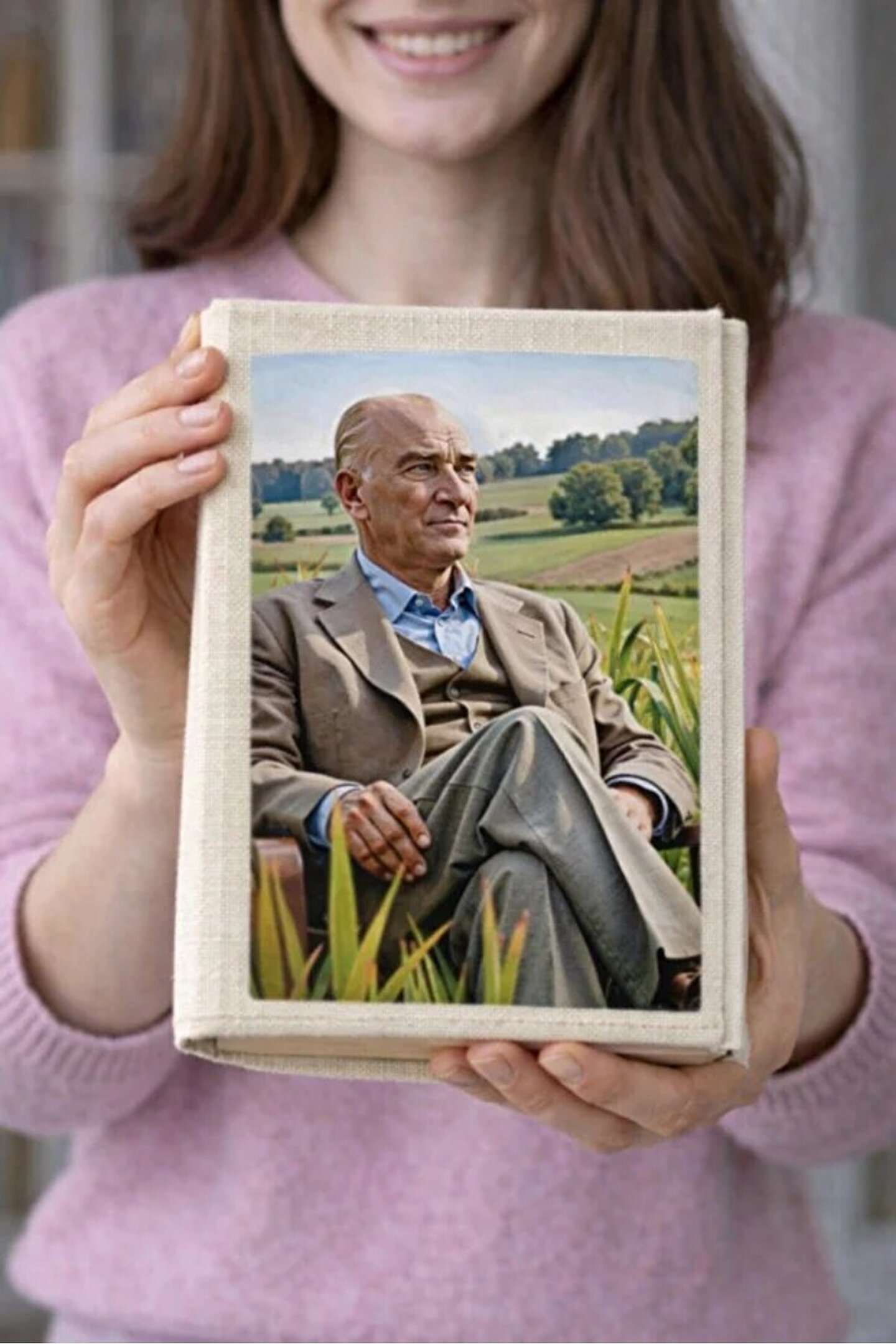 - Türkiye'de üretilmiş olup, yerel işçilik ve kaliteli malzeme ile tasarlanmıştır.; - Atatürk'ün farklı dönemlerine ait görsellerle süslenmiş, kültürel ve tarihi değeri yüksek bir tasarıma sahiptir.; - Bez defter ve kitaplarınızı korumak için idealdir, çizilmelere ve darbelere karşı dayanıklılık sağlar.; - Kitap ayraç olarak kullanıldığında sayfalarınızın işaretlenmesini kolaylaştırır ve okuma deneyiminizi zenginleştirir.; - Hem kişisel kullanım hem de hediye olarak tercih edilebilecek şık ve anlamlı bir aksesuardır.; - Ürün Ebat 23x31cm - Ürün %100 Pamukdan imal edilmiştir.;