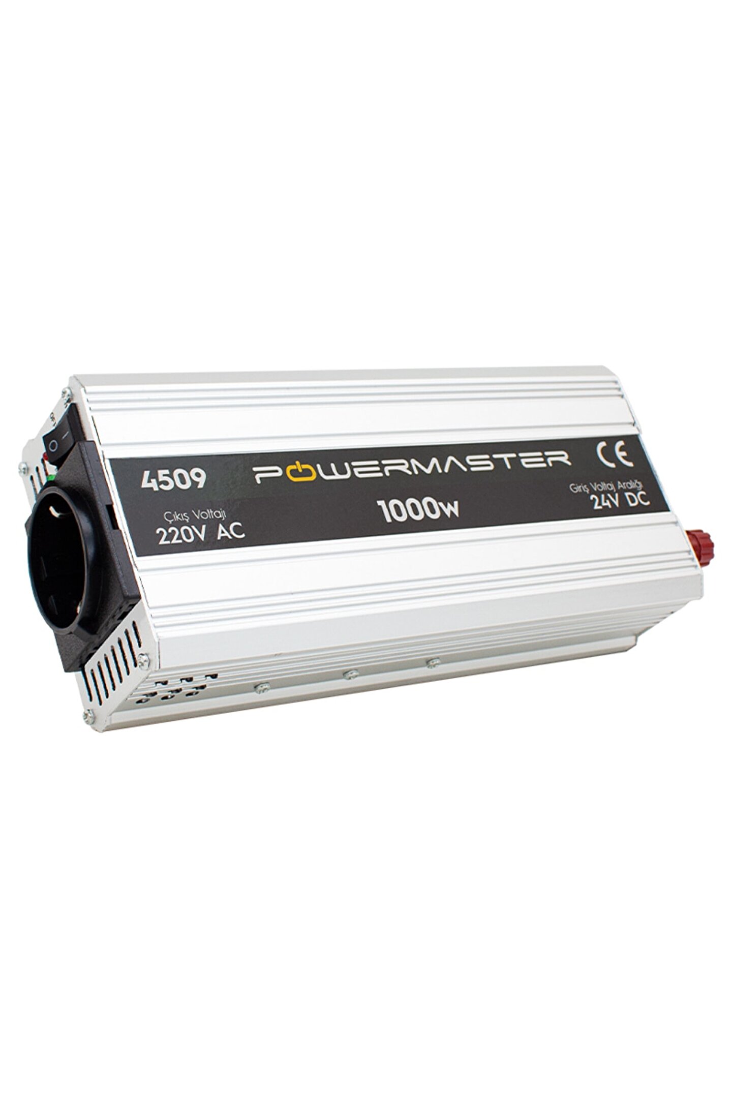 Powermaster 24 Volt 1000 Watt Modified Sinus İnverter PM-4509 Özellikleri Tanım : 24 V-220V Çevirici İnvertör; Güç : 1000 Watt; Çıkış Voltajı : 220 V AC; Girişi Voltaj Aralığı : 24 Volt DC; Çıkış Dalgası : Modifield Sinus; Çıkış Frekansı : 50Hz +/-3Hz, 60Hz +/-3Hz; Aşırı yük ve ısınmaya karşı koruma; Düşük Akım Koruma : 20V +/-0.5V; Yüksek Akım Koruma : 28V +/-0.5V; Maksimum Verimlilik : % 85; Çalışma Sıcaklığı : 0°C ~ +75°C; Kapatma Modu Akımı : 10mA; Malzeme : Alüminyum alaşım; Kaliteli, Uzun ömürlü kullanım; CE Belgeli; Model : PM-4509; MLK4509