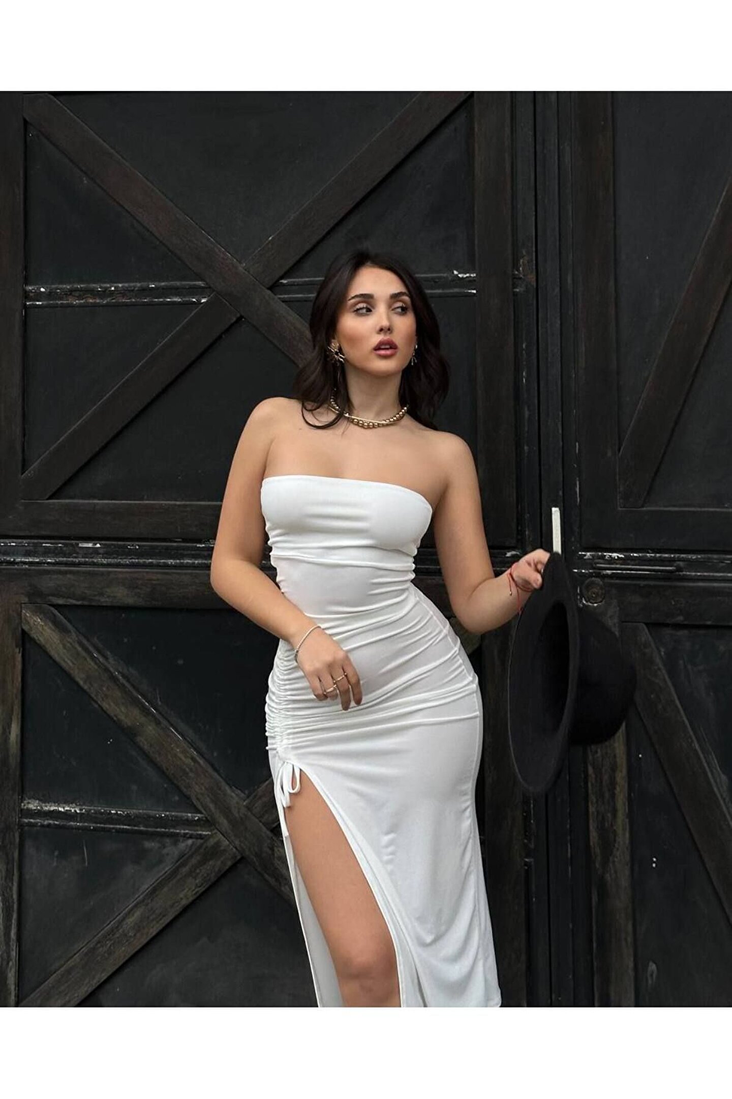 Straplez Beyaz Renk Yırtmaçlı Kadın Elbise