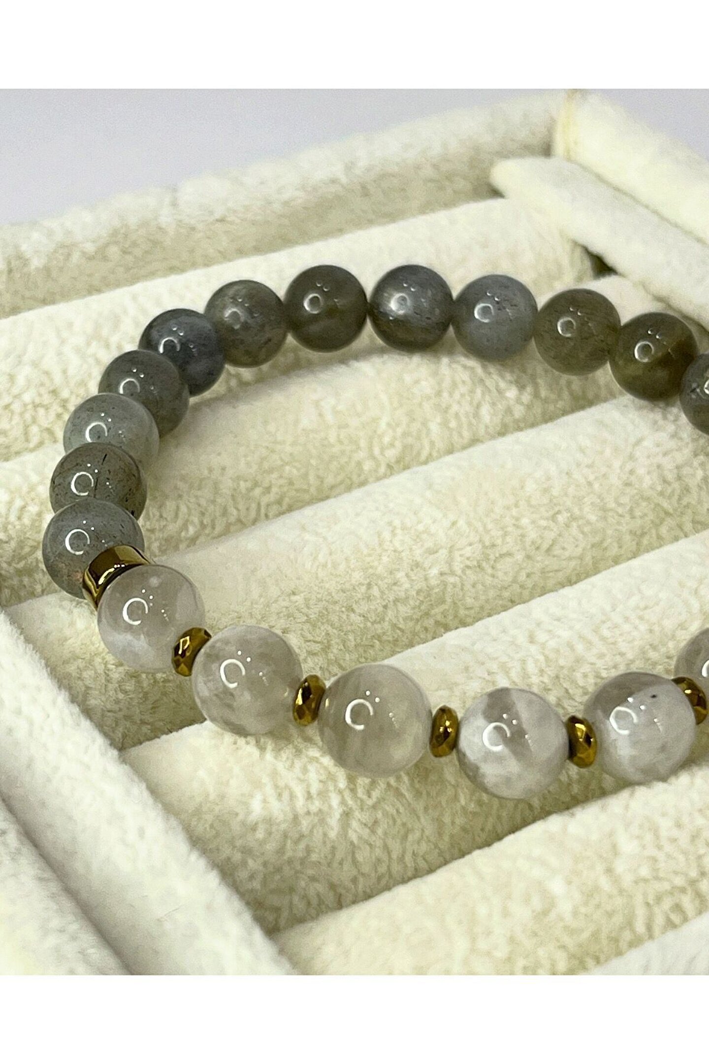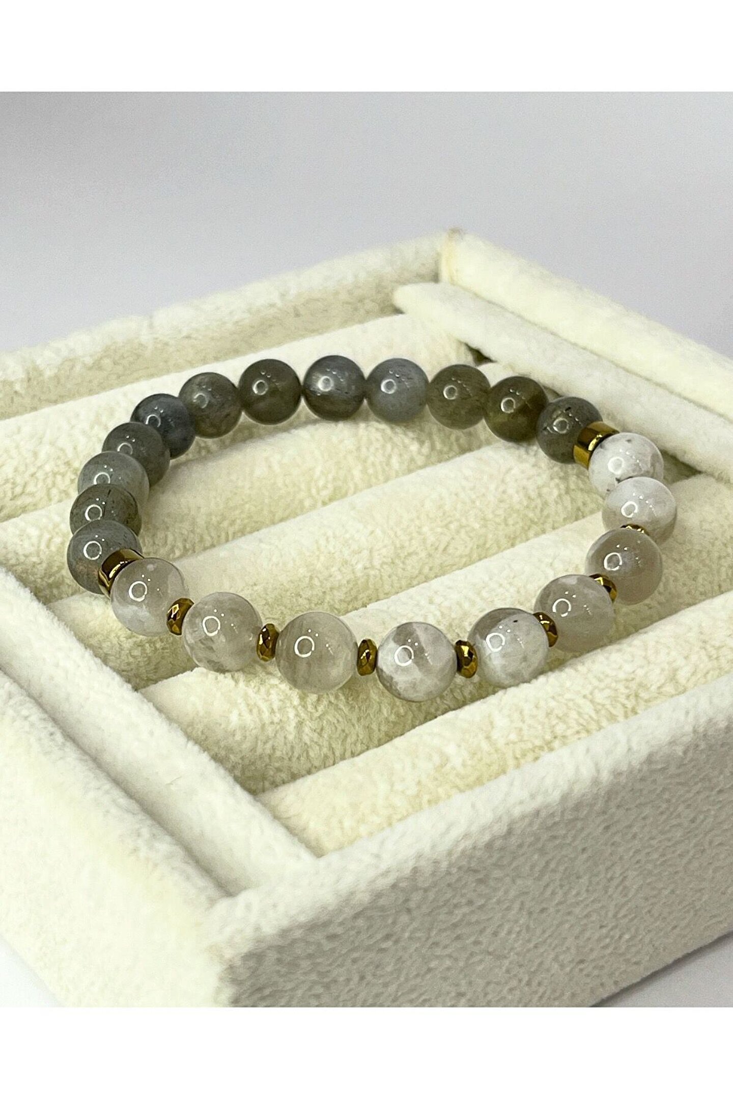 Labradorit taşı , sadece kendine olan özgüveni ve inancı desteklemekle kalmaz, bunun yanında evrene olan güveni de destekler ve yüksek bilince erişmeye de yardımcı olur.; Yoğun ve karmaşık zihni sakinleştirir ve olumsuz enerjilerden korur.; Aynı zamanda enerji verir ya da mevcut olumsuz enerjileri de temizler.; ; Ay Taşı, özellikle Yeni Başlangıçlar Taşı olarak da bilinir ve bu taşın kullanıcıya iç huzuru, duygusal dengelenme ve sezgisel güçler kazandırdığına inanılır .; Duygusal dalgalanmaları yatıştırıcı etkisi ve aşk ile ilişkili chakraları uyumlaştırma gücü, Ay Taşı'nın tercih edilme sebepleri arasındadır.; ; Aralarda kullanılan küçük aparatlar Hematit taşıdır.; ; Taş boyutu 8mm.