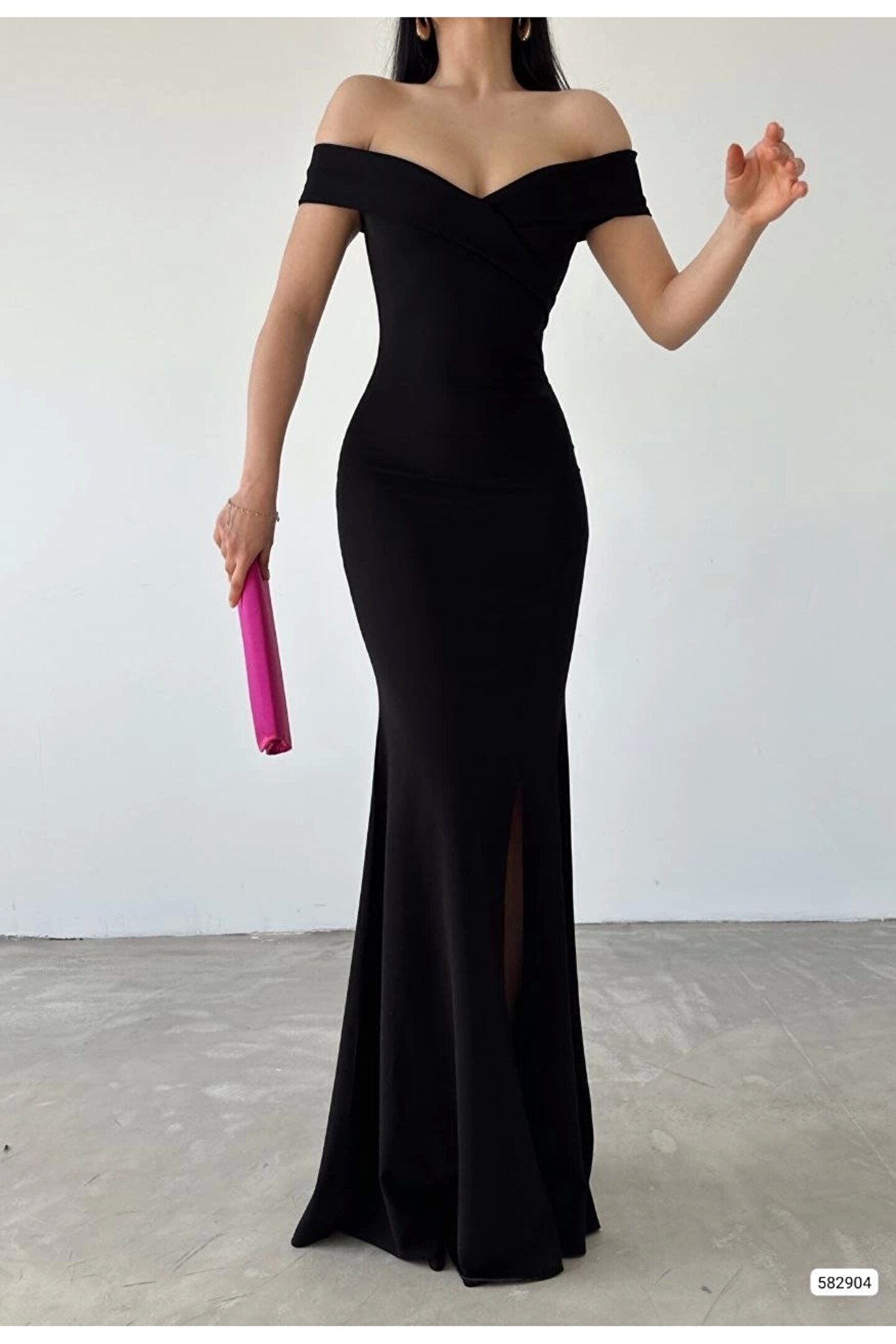 Kadın Dalgıç Kumaş Kayık Yaka Ve Dekolte Detaylı Elbise