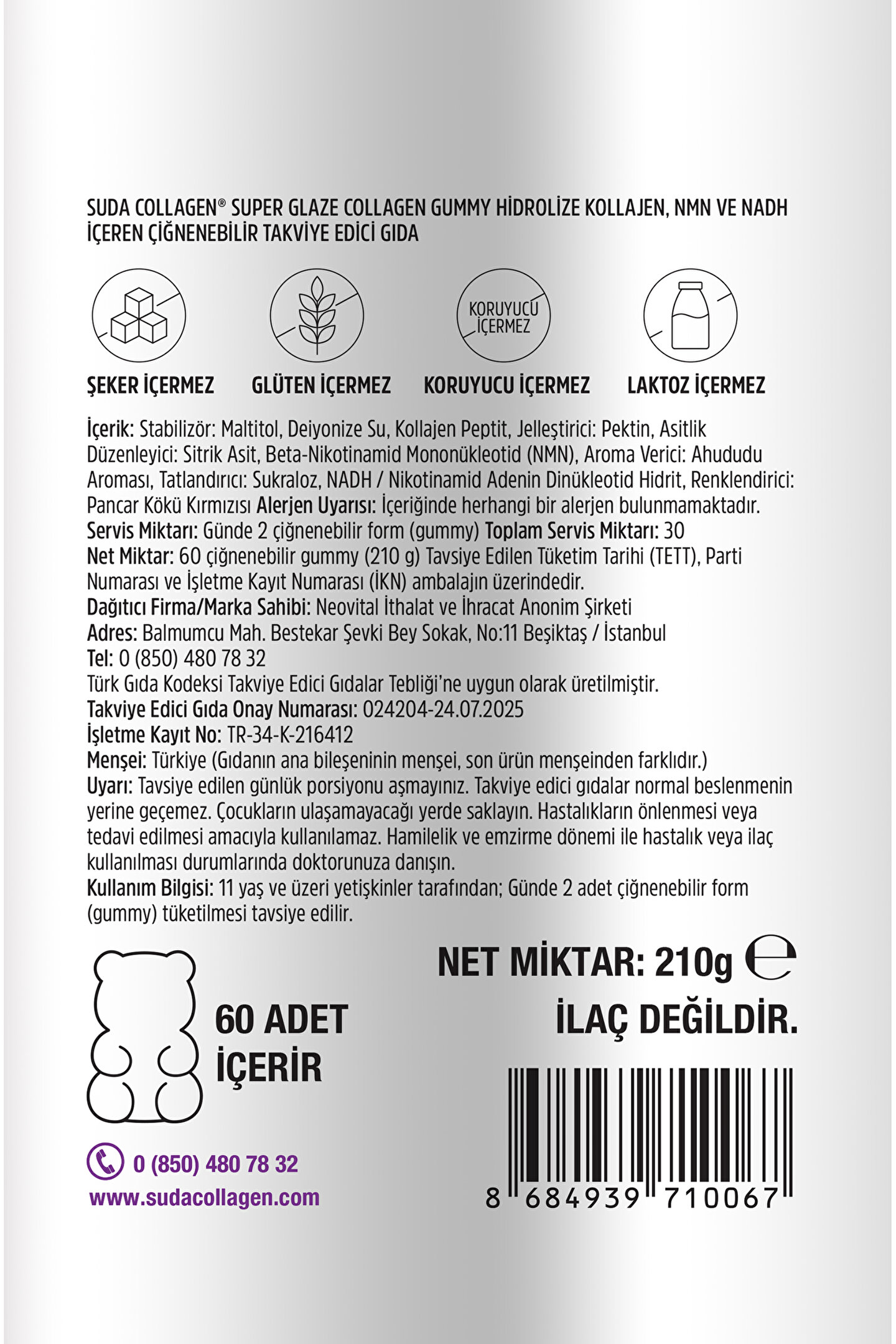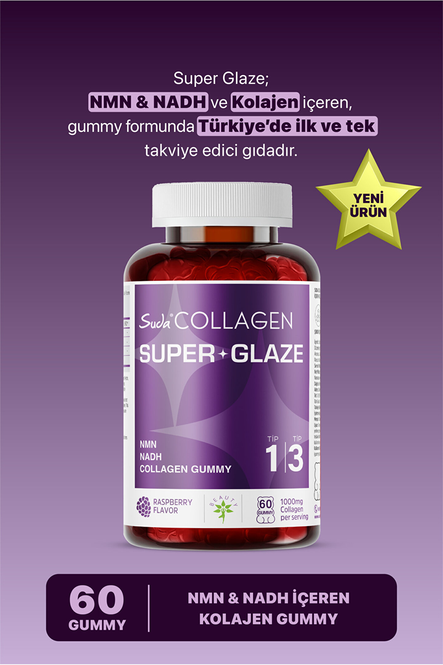 SONSUZ IŞILTI, ÇÜNKÜ BU SENİN ZAMANIN! Suda Collagen’den Türkiye’de bir ilk: Kolajen + NMN + NADH gücünü bir araya getiren Suda Super Glaze Gummy Suda Collagen Super Glaze, NMN ve NADH gücünü taşıyan ahududu aromalı çiğnenebilir formda yeni nesil gıda takviyesidir.; NEDEN TIP I & III KOLAJEN? • Brezilya menşeili patentli kolajen hidrolizatı Peptinex içerir.; • Kolajen Tip I & III; cilt, saç, tırnak, kemik, kıkırdak ve bağ dokularının temel yapı taşıdır.; • Cilt elastikiyetini ve nemini artırmada kırışıklıkların görünümünü azaltmaya, saç ve tırnakların güçlenmesine ve eklem sağlığını desteklemeye yardımcı olur.; • 2.000 Dalton gücündedir! NEDEN NMN & NADH? • NADH sitrik asit döngüsü yoluyla elde edilmiştir.; Analiz sertifikasında, NADH'nin saflık oranının %98,1 olduğu belirtilmiştir.; • NMN; Vücutta yaşlanma karşıtı ve enerji metabolizması için kritik bir molekül olan NAD+ öncülüdür.; Metabolik fonksiyonların iyileşmesine, yaşlanma belirtilerinin yavaşlamasına ve genel hücresel sağlığın korunmasına katkıda bulunur.; • NADH, NAD+'ın indirgenmiş (hidrit) formudur ve doğrudan hücrelerin enerji santrali olan mitokondrilerde ATP (enerji) üretimi için kullanılır.; Enerji seviyelerinin artırılmasına yardımcı olur, bu da fiziksel ve zihinsel performansı destekler.; Antioksidan özelliği sayesinde hücresel hasara karşı koruma destekleyicidir.; Suda Collagen Super Glaze, şeker, glüten, koruyucu ve laktoz içermez.; KULLANIM ŞEKLİ: 11 yaş ve üzeri yetişkinler tarafından; Günde 2 adet çiğnenebilir form (gummy) tüketilmesi tavsiye edilir.; 1 şişede 60 gummy bulunmaktadır (30 günlük doz) KALİTE GÜVENCESİ: GMP, FDA, Helal ve Kosher sertifikalarına sahiptir.;