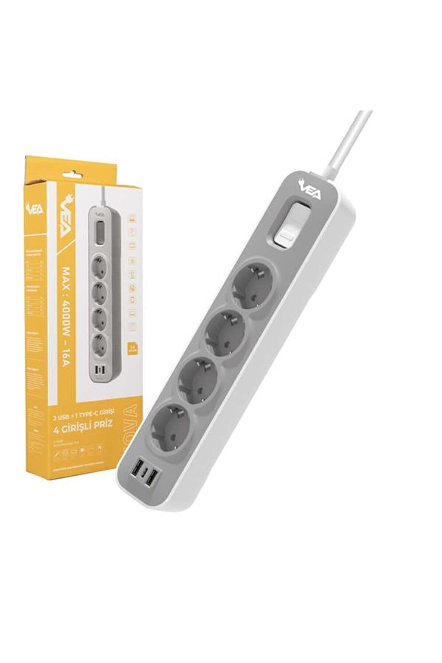 Vea VE-NOVA104U A Class 4'lü Anahtarlı 1.5 Metre Grup Priz Özellikleri Ev ve ofislerinizde enerji yönetimini en üst düzeye çıkaracak Vea VE-NOVA104U A Class 5'li Anahtarlı 1.5 Metre Grup Priz ile tanışın.; Bu güçlü grup prizi, benzersiz özellikleri ve dayanıklı tasarımı ile evinizde ve iş yerinizde güvenliği ve verimliliği bir araya getirir.; İçerisinde kullanılan bakır kablo, 4000W'a kadar maksimum enerji iletimi sağlar.; 16 amper kapasitesi ve 220-250V voltaj aralığı, çeşitli cihazları sorunsuz bir şekilde bağlamanıza olanak tanır.; 1.5 metre uzunluğundaki kablo, esnek yerleşim imkanı sunarak elektronik cihazlarınızın düzenini kolaylaştırır.; Nikel metal ile yerleşik parçalara sahip olan anahtar, 10000'den fazla açma-kapama döngüsünü destekleyerek dayanıklılığını kanıtlar.; Ürünün bakır plaka içinde yüksek iletkenlikle çalışması, enerjinin kayıpsız bir şekilde iletilmesini sağlar.; Çevre dostu ve yangın önleyici malzemeden üretilen Vea VE-NOVA104U, kullanıcıların güvenliğini her zaman ön planda tutar.; İletkenlik oranları bakımından bakırın %100, altının %70, alüminyumun %61, pirincin %28 ve nikel alaşımının %7 olduğu bu ürün, enerji verimliliği açısından çığır açar.; Vea VE-NOVA104U, akım koruma, çocuk koruma ve yangın koruma özellikleriyle donatılmış olup, açma-kapama tuşuyla da kullanım kolaylığı sunar.; Modern tasarımı ve yüksek performansıyla Vea VE-NOVA104U, enerji yönetimine yeni bir boyut kazandırıyor.; Enerjiyi akıllıca yönetin, güvenliği bir adım öteye taşıyın.; Vea VE-NOVA104U ile evinizde ve iş yerinizde enerji kontrolü sizin elinizde! Bakır Kablo: 3*1.5mm; Maksimum Güç: 4000W; Amparaj: 16 Amper; Voltaj Aralığı: 220-250 Volt; Kablo Uzunluğu: 1.5 Metre; Yuva Sayısı: 4; Boyut: 296 x 65 x 48 mm; Malzeme İletkenlik Oranları:; Bakır: %100; Altın: %70; Aliminyum: %61; Pirinç: %28; Nikel Alaşımı: %7; Özellikler:; Akım Koruma; Çocuk Koruma; Yangın Koruma; Açma-Kapama Tuşu; Özel Tasarım:; Anahtarın nikel metal ile yerleşik parçaları, 10000 defadan fazla açma kapamayı destekler.; ; Bakır plaka içinde yüksek iletkenlikle çalışır.; ; Çevre dostu ve yangın önleyici malzemeden üretilmiştir.; ; Çıkışlar:; 1X Type-C: 5 Volt 2.6 Amper 14 Watt; 2X USB: 5 Volt 2.6 Amper 14 Watt; ;