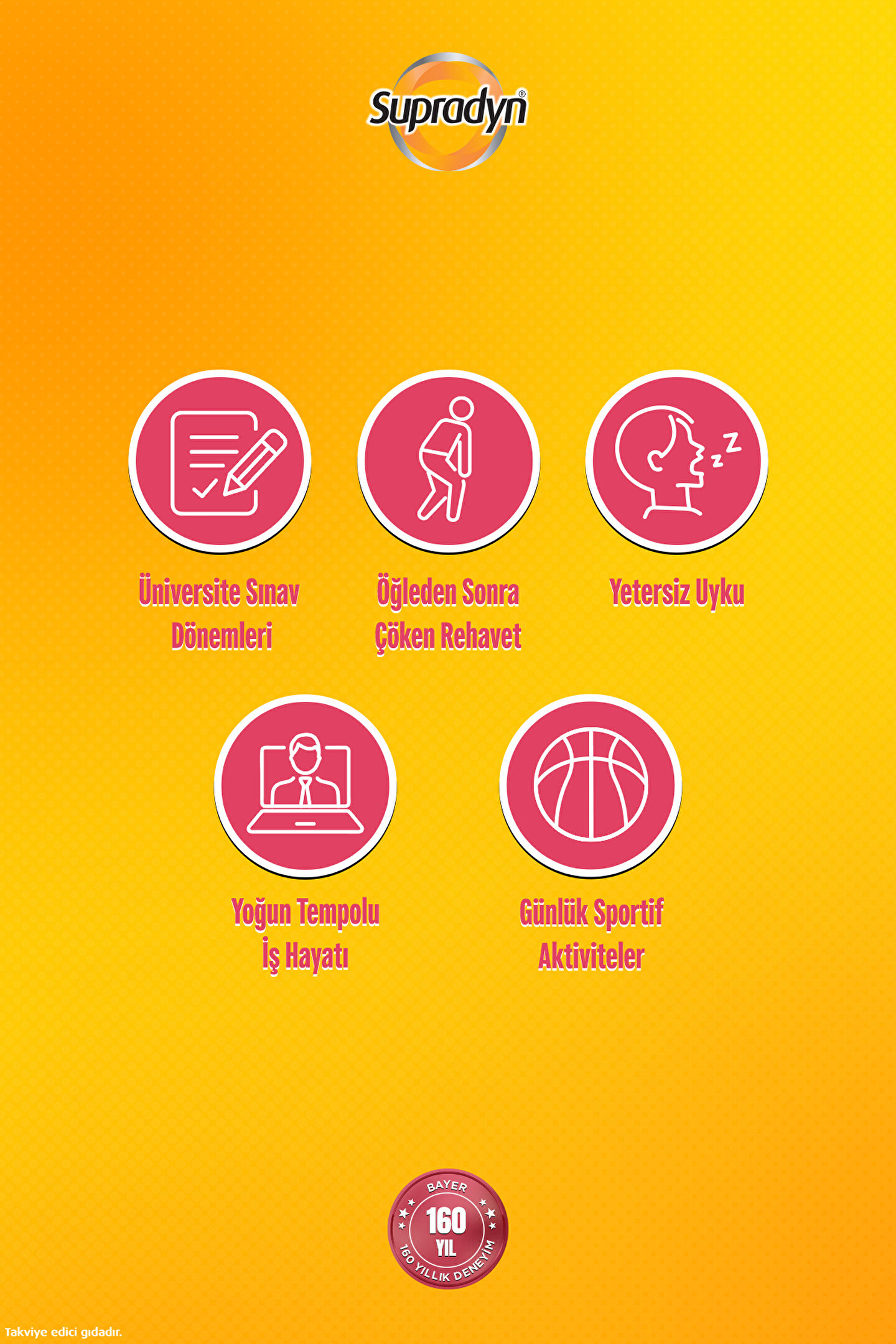 Yeni Supradyn Energy Boost “Memnun Kalmazsan Paran İade” Kampanyasına katılmak için gerekli adımlar:; ;1. Tüketici supradynenergyboost-paraniade.com adresindeki iade formunu doldurmalı.;2. Tüketici iade formunu ıslak imzalı şekilde, ürünün kendisi ve fiş/faturası ile beraber iade formunda belirtilen adrese kargolamalı.;3. Başvurular değerlendirildikten sonra uygun bulunduğu takdirde 10 iş günü içerisinde tüketicinin banka hesap bilgileri doğrultusunda tutar iadesi gerçekleştirilir.;Not: Kapmanyaya katılım koşulları, supradynenergyboost-paraniade.com adresindeki iade formunda yer almaktadır. Kampanyaya katılım için Supradyn Energy Boost 15 Efervesan ürününden en fazla 3 tabletin tüketilmiş olması gerekmektedir.;