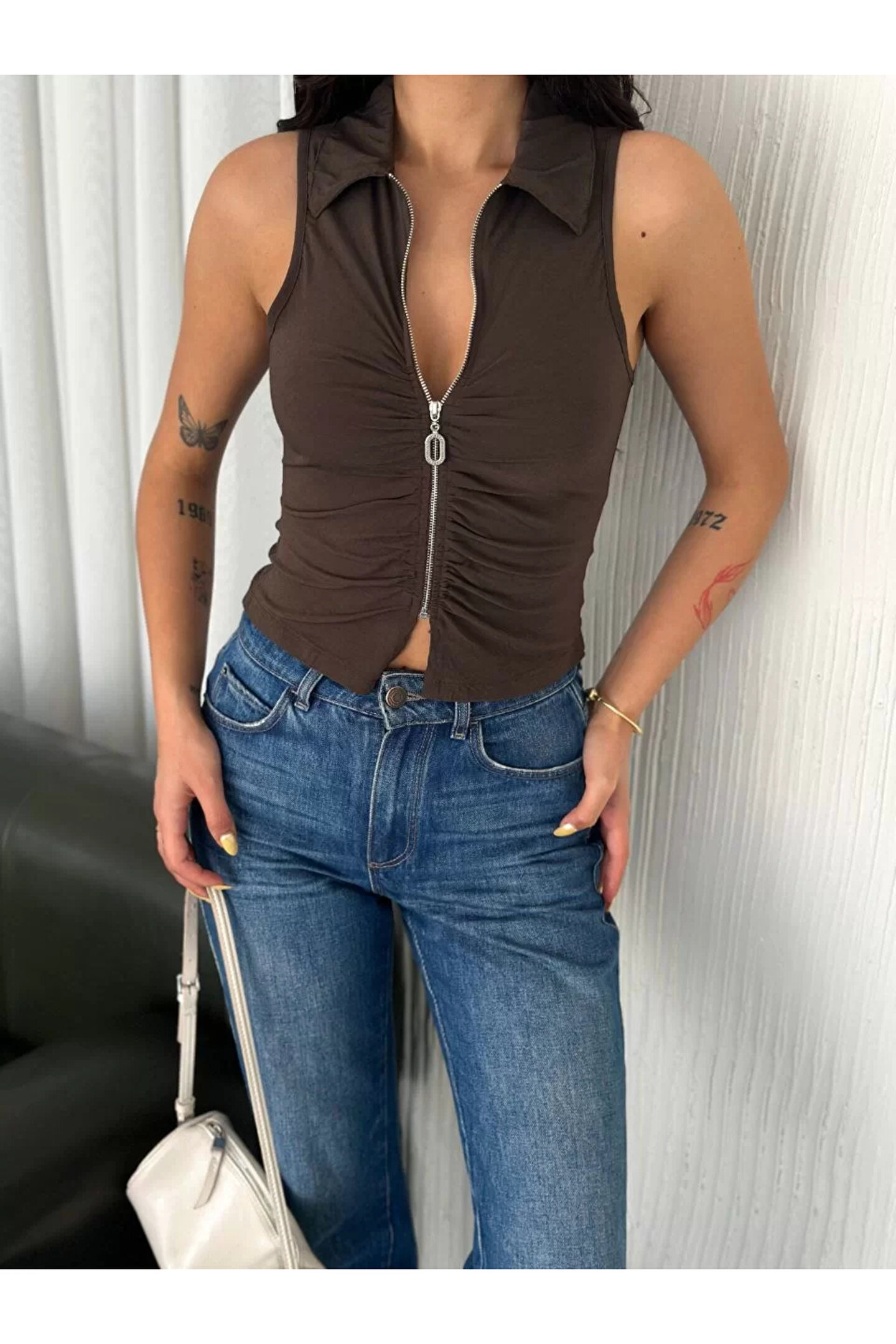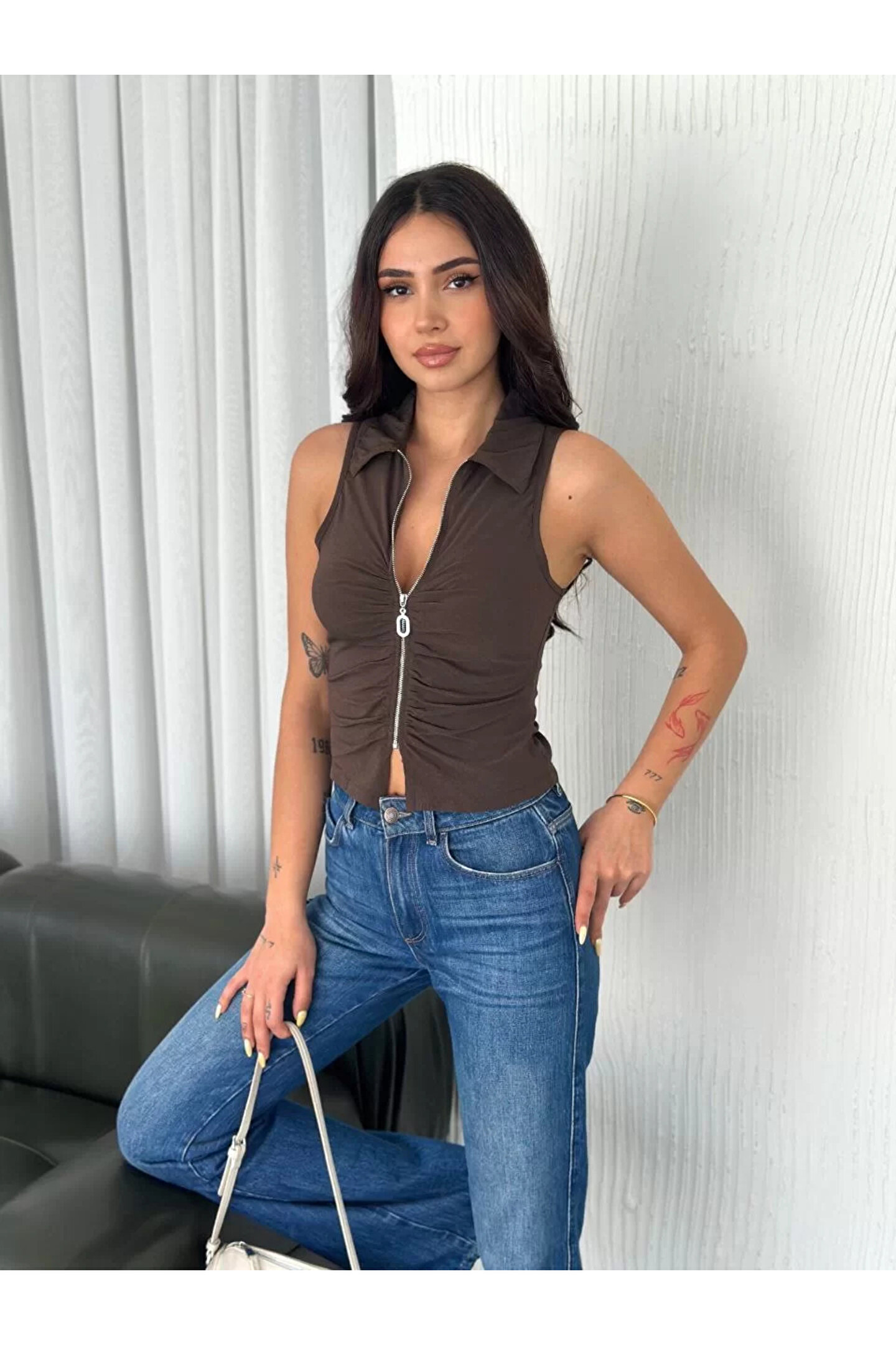 Yakalı Tam Fermuarlı Kolsuz Bluz - Kahverengi