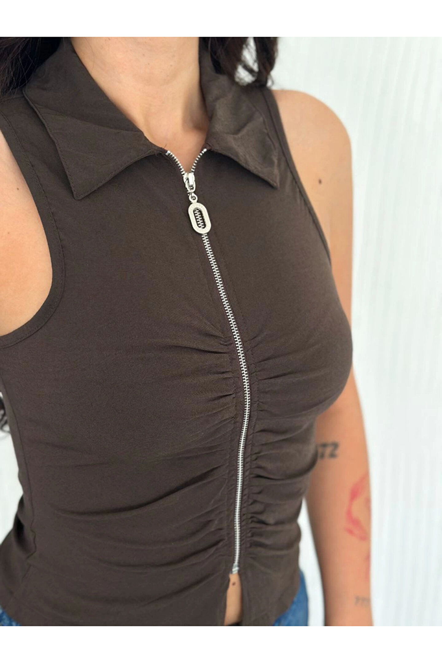 Yakalı Tam Fermuarlı Kolsuz Bluz - Kahverengi