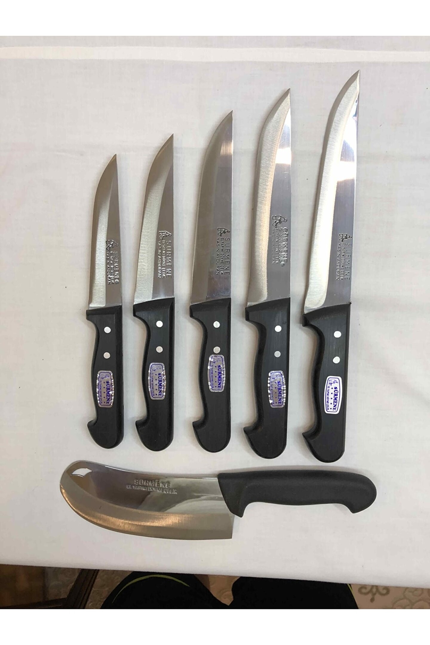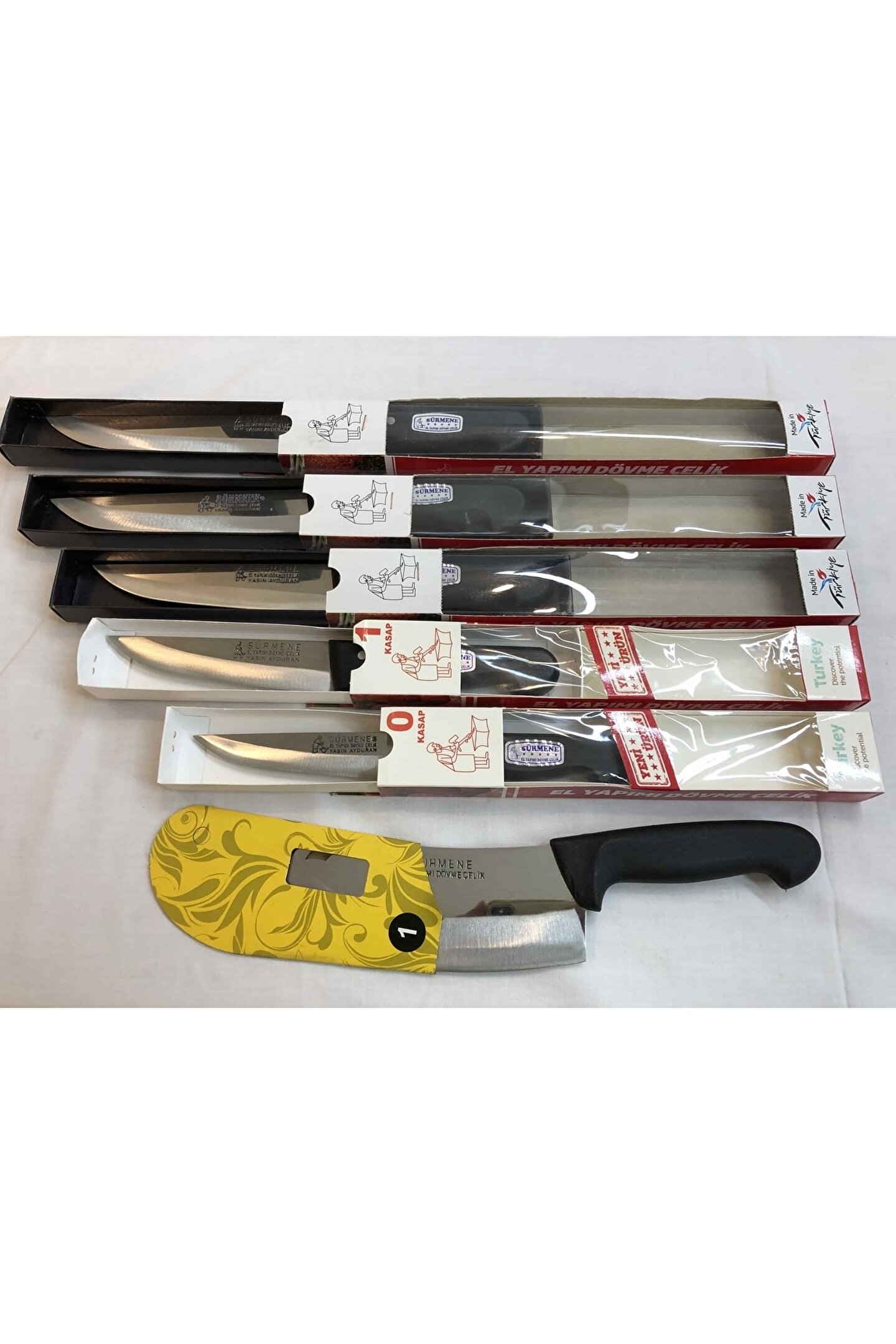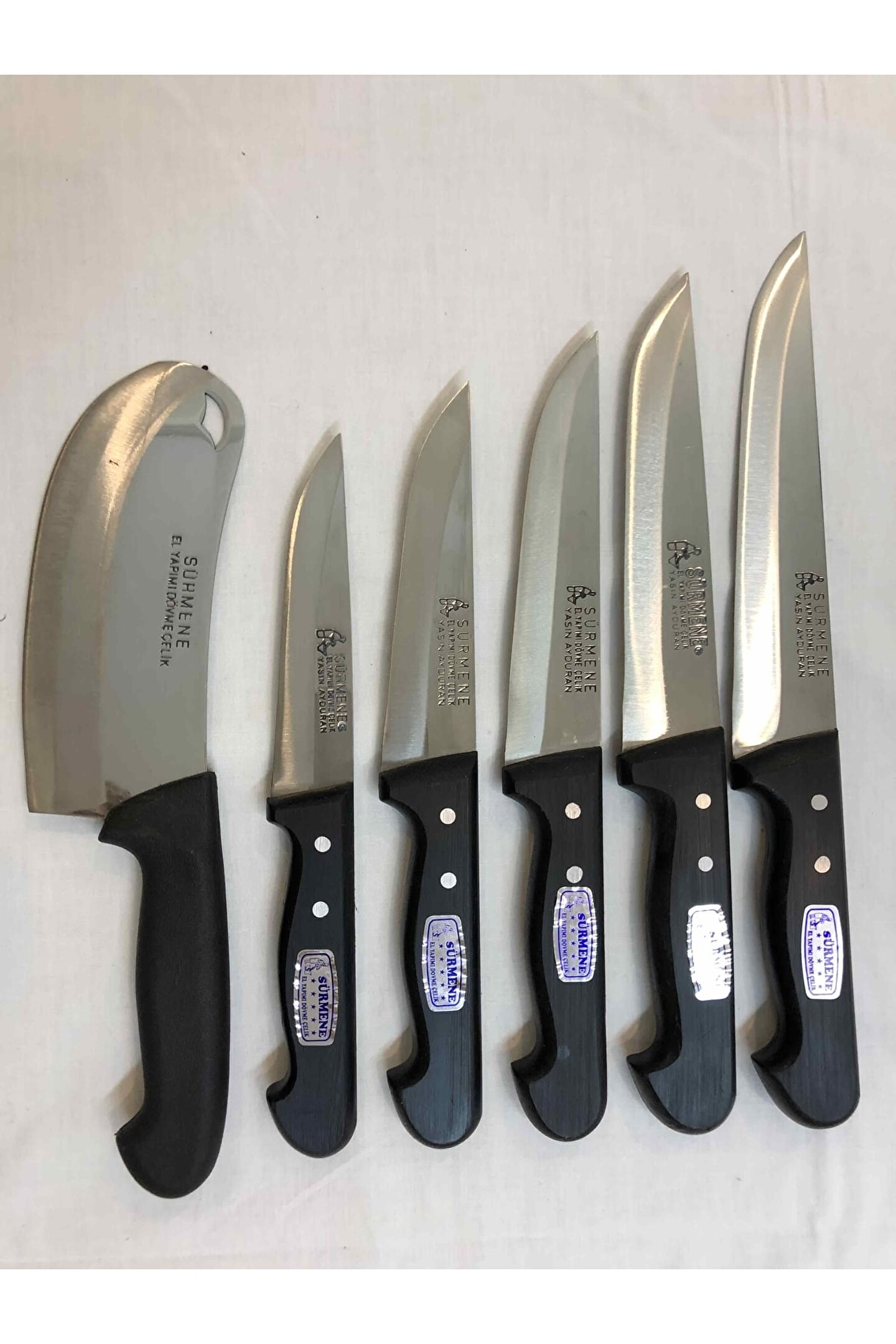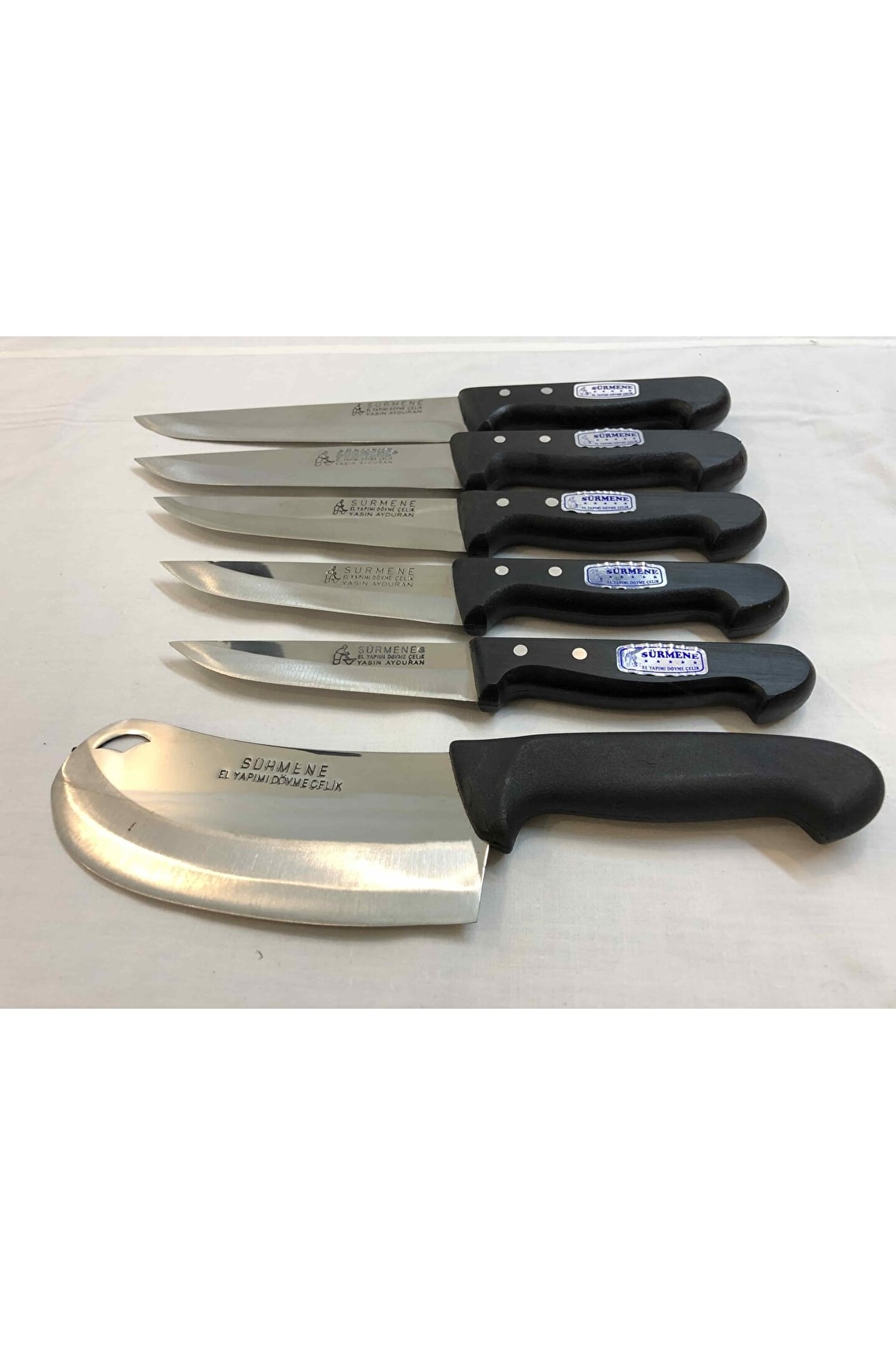 ÇELİK KALINLIĞI : 2,5 mm PASLANMAZ DÖVME ÇUBUK ÇELİK SAP : SiYAH KAYDIRMAZ PLASTiK ÜRÜNÜN AÇIKLAMASI : 0 Numara Bıçak : Tam Boy : 26 Cm Bicak Boyu : 13 Cm En : 3 Cm Ağılık : 107 Gram 1 Numara Bıçak : Tam Boy : 27 Cm Bicak Boyu : 13; 5 Cm En : 3; 5 Cm Ağılık : 125 Gram 2 Numara Bıçak : Tam Boy : 29 Cm Bicak Boyu : 15; 5 Cm En : 3; 5 Cm Ağılık : 137 Gram 3 Numara Bi; ak : Tam Boy : 31 Cm Bicak Boyu : 17; 5 Cm En : 3; 5 Cm Ağılık : 153 Gram 4 Numara Bıçak : Tam Boy : 32; 5 Cm Bicak Boyu : 20 Cm En : 4 Cm Ağılık : 163 Gram 2 Numara Satır : Tam Boy : 29 Cm Bicak Boyu : 16; 5 Cm En : 6; 5 Cm Ağılık : 190 Gram;