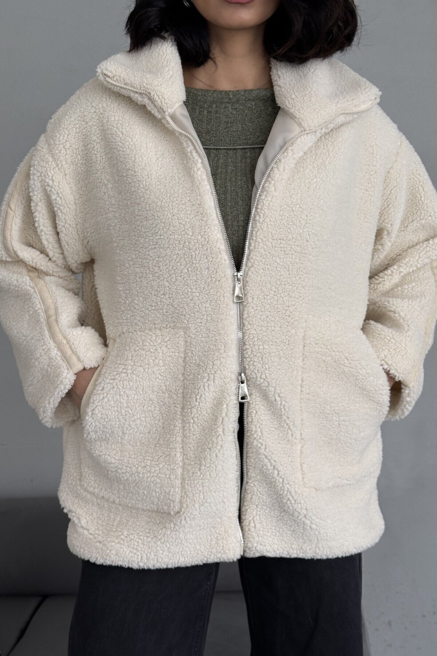 Bej Dik Yakalı Cepli Peluş Mont